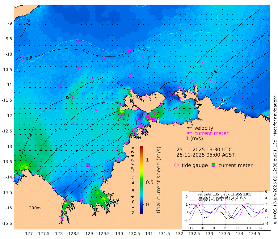80cm/s -100T +4cm/s rms + 6cm/s 51T. Darwin_C1 52m 47cm/s -92T +4cm/s rms + 7cm/s -161T. Darwin_CW1 22m 25cm/s -107T +4cm/s rms + 8cm/s 61T. Darwin_CW2 34m 51cm/s -137T +3cm/s rms + 9cm/s 98T. Darwin_CW3 22m 43cm/s -90T +5cm/s rms + 7cm/s 88T. Darwin_C3 56m 46cm/s -115T +2cm/s rms + 9cm/s -126T. Darwin_CTbW 22m 10cm/s 138T +9cm/s rms + 2cm/s -110T. NWSLYN 196m 14cm/s 104T +1cm/s rms + 1cm/s -47T. DARBGF 30m 12cm/s 35T +7cm/s rms + 2cm/s -137T. ITFTIS 464m 12cm/s 50T +9cm/s rms + 1cm/s 74T. ITFMHB 146m 11cm/s 89T +4cm/s rms + 1cm/s -134T. ITFJBG 61m 18cm/s 90T +6cm/s rms + 4cm/s 121T. ITFFTB 108m 16cm/s 145T +4cm/s rms + 3cm/s 80T. NRSDAR 19m 50cm Carronade Island 48cm Guy Point 58cm Napier Broome Bay 21cm Lesueur Island -48cm Reveley Island -26cm Rocky Island -93cm Cape Domett -82cm Lacrosse Island -128cm Adolphus Island -110cm Pender Point -116cm Wyndham 67cm The Boxers 72cm Unnamed Shoal 83cm Loxton Shoal -103cm Pelican Island 70cm Calder Shoal 72cm Evans Shoal -175cm Quoin Island -71cm Port Keats -62cm Jones Point -182cm Catfish Island -27cm Cape Scott Offshore 80cm Cape Ford -31cm Anson Bay 75cm Goodrich Bank -14cm Peron Island North -5cm Point Jenny -1cm Native Point -11cm Fish Reef -16cm Tapa Bay 43cm Point Fawcett (Offshore) -23cm Burge Point -15cm Munkunuwa 10cm Beagle A -32cm Parsons Bank -25cm Fenton Patches 69cm Lynedoch Bank -42cm Hancox Shoal Area -51cm Nightcliff -37cm Darwin -12cm Charles Point Patches -44cm Glyde Point -81cm Chambers Bay -80cm Point Stuart -52cm Cape Hotham -69cm Christine Reef -96cm West Alligator Head -103cm East Field Island -53cm Two Hills Bay 43cm Newby Shoal -40cm Camp Point -14cm Medina Inlet South 49cm South Barlow Point 59cm St. Asaph Bay 76cm Cape Van Dieman 73cm Snake Bay 69cm Cache Point 76cm Echo Shoal 50cm Point Jahleel (Off) 15cm Cape Don 50cm Port Essington 44cm Smith Point - West 47cm NW Peacock Island 52cm North Of Jones Shoal 17cm Peacock Island 32cm Point David 44cm D'urville Point 50cm Money Shoal 26cm Copeland Island 31cm Cape Cockburn 32cm One Tree Point 39cm Hogmany Shoal 33cm New Year Island - West 31cm Grant Island 3cm Aurari Bay -5cm Cuthbert Point 11cm North Goulburn Island -11cm Paxie Shoal -32cm Entrance Island -61cm Yabooma Island