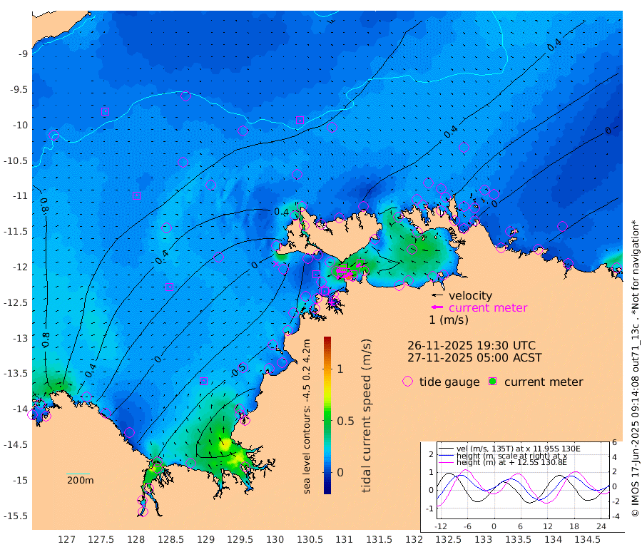 106cm/s -101T +4cm/s rms + 6cm/s 51T. Darwin_C1 52m 55cm/s -91T +4cm/s rms + 7cm/s -161T. Darwin_CW1 22m 40cm/s -107T +4cm/s rms + 8cm/s 61T. Darwin_CW2 34m 53cm/s -135T +3cm/s rms + 9cm/s 98T. Darwin_CW3 22m 54cm/s -91T +5cm/s rms + 7cm/s 88T. Darwin_C3 56m 62cm/s -115T +2cm/s rms + 9cm/s -126T. Darwin_CTbW 22m 9cm/s 139T +9cm/s rms + 2cm/s -110T. NWSLYN 196m 6cm/s -112T +1cm/s rms + 1cm/s -47T. DARBGF 30m 11cm/s 33T +7cm/s rms + 2cm/s -137T. ITFTIS 464m 12cm/s 38T +9cm/s rms + 1cm/s 74T. ITFMHB 146m 11cm/s 30T +4cm/s rms + 1cm/s -134T. ITFJBG 61m 13cm/s 61T +6cm/s rms + 4cm/s 121T. ITFFTB 108m 7cm/s -114T +4cm/s rms + 3cm/s 80T. NRSDAR 19m 66cm Carronade Island 65cm Guy Point 77cm Napier Broome Bay 22cm Lesueur Island -52cm Reveley Island -17cm Rocky Island -85cm Cape Domett -78cm Lacrosse Island -104cm Adolphus Island -61cm Pender Point -56cm Wyndham 50cm The Boxers 41cm Unnamed Shoal 74cm Loxton Shoal -103cm Pelican Island 50cm Calder Shoal 58cm Evans Shoal -131cm Quoin Island -88cm Port Keats -79cm Jones Point -110cm Catfish Island -52cm Cape Scott Offshore 22cm Cape Ford -62cm Anson Bay 53cm Goodrich Bank -46cm Peron Island North -42cm Point Jenny -39cm Native Point -45cm Fish Reef -55cm Tapa Bay 12cm Point Fawcett (Offshore) -60cm Burge Point -54cm Munkunuwa -27cm Beagle A -70cm Parsons Bank -61cm Fenton Patches 54cm Lynedoch Bank -74cm Hancox Shoal Area -85cm Nightcliff -70cm Darwin -46cm Charles Point Patches -57cm Glyde Point -68cm Chambers Bay -63cm Point Stuart -57cm Cape Hotham -61cm Christine Reef -73cm West Alligator Head -70cm East Field Island -49cm Two Hills Bay 14cm Newby Shoal -37cm Camp Point -50cm Medina Inlet South 16cm South Barlow Point 31cm St. Asaph Bay 52cm Cape Van Dieman 47cm Snake Bay 48cm Cache Point 75cm Echo Shoal 29cm Point Jahleel (Off) 0cm Cape Don 30cm Port Essington 22cm Smith Point - West 25cm NW Peacock Island 34cm North Of Jones Shoal 10cm Peacock Island 9cm Point David 20cm D'urville Point 32cm Money Shoal 4cm Copeland Island 4cm Cape Cockburn 12cm One Tree Point 13cm Hogmany Shoal 12cm New Year Island - West 8cm Grant Island -15cm Aurari Bay -20cm Cuthbert Point -8cm North Goulburn Island -22cm Paxie Shoal -44cm Entrance Island -65cm Yabooma Island