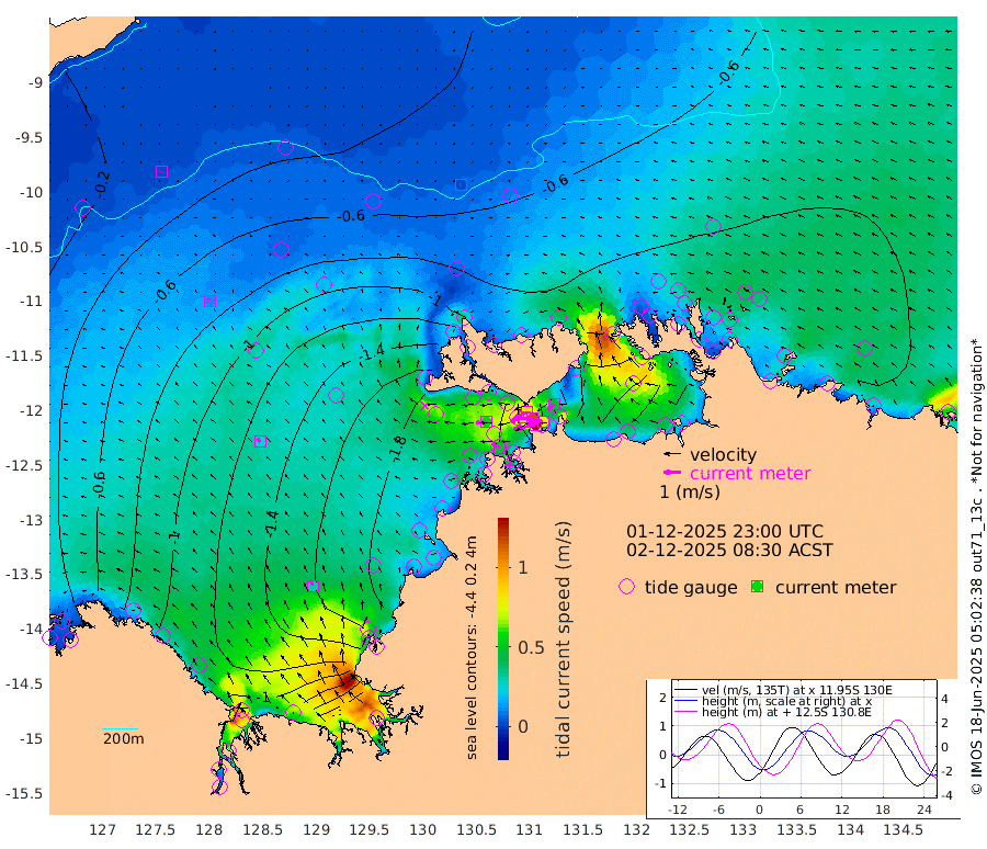 127cm/s -102T +4cm/s rms + 6cm/s 51T. Darwin_C1 52m 81cm/s -90T +4cm/s rms + 7cm/s -161T. Darwin_CW1 22m 87cm/s -107T +4cm/s rms + 8cm/s 61T. Darwin_CW2 34m 48cm/s -129T +3cm/s rms + 9cm/s 98T. Darwin_CW3 22m 114cm/s -92T +5cm/s rms + 7cm/s 88T. Darwin_C3 56m 81cm/s -116T +2cm/s rms + 9cm/s -126T. Darwin_CTbW 22m 3cm/s -109T +9cm/s rms + 2cm/s -110T. NWSLYN 196m 56cm/s -93T +1cm/s rms + 1cm/s -47T. DARBGF 30m 3cm/s -168T +7cm/s rms + 2cm/s -137T. ITFTIS 464m 11cm/s -12T +9cm/s rms + 1cm/s 74T. ITFMHB 146m 31cm/s -18T +4cm/s rms + 1cm/s -134T. ITFJBG 61m 25cm/s -43T +6cm/s rms + 4cm/s 121T. ITFFTB 108m 48cm/s -61T +4cm/s rms + 3cm/s 80T. NRSDAR 19m -3cm Carronade Island 1cm Guy Point 4cm Napier Broome Bay -80cm Lesueur Island -122cm Reveley Island -57cm Rocky Island -139cm Cape Domett -140cm Lacrosse Island -109cm Adolphus Island -17cm Pender Point 5cm Wyndham -89cm The Boxers -106cm Unnamed Shoal -30cm Loxton Shoal -161cm Pelican Island -85cm Calder Shoal -46cm Evans Shoal -83cm Quoin Island -193cm Port Keats -186cm Jones Point -60cm Catfish Island -182cm Cape Scott Offshore -255cm Cape Ford -202cm Anson Bay -67cm Goodrich Bank -195cm Peron Island North -208cm Point Jenny -208cm Native Point -211cm Fish Reef -218cm Tapa Bay -149cm Point Fawcett (Offshore) -223cm Burge Point -200cm Munkunuwa -202cm Beagle A -209cm Parsons Bank -226cm Fenton Patches -46cm Lynedoch Bank -203cm Hancox Shoal Area -222cm Nightcliff -217cm Darwin -213cm Charles Point Patches -146cm Glyde Point -86cm Chambers Bay -67cm Point Stuart -117cm Cape Hotham -86cm Christine Reef -64cm West Alligator Head -36cm East Field Island -86cm Two Hills Bay -163cm Newby Shoal -84cm Camp Point -206cm Medina Inlet South -132cm South Barlow Point -111cm St. Asaph Bay -74cm Cape Van Dieman -76cm Snake Bay -78cm Cache Point -14cm Echo Shoal -80cm Point Jahleel (Off) -94cm Cape Don -79cm Port Essington -87cm Smith Point - West -80cm NW Peacock Island -67cm North Of Jones Shoal -24cm Peacock Island -77cm Point David -86cm D'urville Point -65cm Money Shoal -76cm Copeland Island -103cm Cape Cockburn -75cm One Tree Point -95cm Hogmany Shoal -80cm New Year Island - West -82cm Grant Island -80cm Aurari Bay -82cm Cuthbert Point -83cm North Goulburn Island -67cm Paxie Shoal -84cm Entrance Island -70cm Yabooma Island