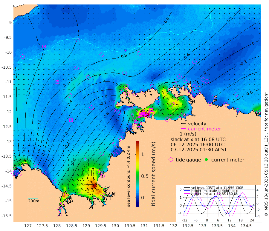 181cm/s -101T +4cm/s rms + 6cm/s 51T. Darwin_C1 52m 141cm/s -90T +4cm/s rms + 7cm/s -161T. Darwin_CW1 22m 86cm/s -107T +4cm/s rms + 8cm/s 61T. Darwin_CW2 34m 80cm/s -133T +3cm/s rms + 9cm/s 98T. Darwin_CW3 22m 121cm/s -91T +5cm/s rms + 7cm/s 88T. Darwin_C3 56m 101cm/s -115T +2cm/s rms + 9cm/s -126T. Darwin_CTbW 22m 10cm/s 140T +9cm/s rms + 2cm/s -110T. NWSLYN 196m 28cm/s -96T +1cm/s rms + 1cm/s -47T. DARBGF 30m 12cm/s 39T +7cm/s rms + 2cm/s -137T. ITFTIS 464m 16cm/s 43T +9cm/s rms + 1cm/s 74T. ITFMHB 146m 24cm/s 3T +4cm/s rms + 1cm/s -134T. ITFJBG 61m 17cm/s 38T +6cm/s rms + 4cm/s 121T. ITFFTB 108m 26cm/s -78T +4cm/s rms + 3cm/s 80T. NRSDAR 19m 169cm Carronade Island 173cm Guy Point 181cm Napier Broome Bay 74cm Lesueur Island -65cm Reveley Island -25cm Rocky Island -116cm Cape Domett -96cm Lacrosse Island -109cm Adolphus Island -31cm Pender Point 6cm Wyndham 71cm The Boxers 41cm Unnamed Shoal 123cm Loxton Shoal -156cm Pelican Island 76cm Calder Shoal 89cm Evans Shoal -139cm Quoin Island -153cm Port Keats -163cm Jones Point -62cm Catfish Island -101cm Cape Scott Offshore -112cm Cape Ford -125cm Anson Bay 68cm Goodrich Bank -107cm Peron Island North -105cm Point Jenny -103cm Native Point -119cm Fish Reef -129cm Tapa Bay -13cm Point Fawcett (Offshore) -142cm Burge Point -142cm Munkunuwa -76cm Beagle A -154cm Parsons Bank -134cm Fenton Patches 80cm Lynedoch Bank -145cm Hancox Shoal Area -150cm Nightcliff -157cm Darwin -125cm Charles Point Patches -101cm Glyde Point -63cm Chambers Bay -66cm Point Stuart -83cm Cape Hotham -56cm Christine Reef -74cm West Alligator Head -53cm East Field Island -55cm Two Hills Bay 11cm Newby Shoal -44cm Camp Point -126cm Medina Inlet South -5cm South Barlow Point 25cm St. Asaph Bay 62cm Cape Van Dieman 58cm Snake Bay 63cm Cache Point 144cm Echo Shoal 39cm Point Jahleel (Off) -5cm Cape Don 30cm Port Essington 26cm Smith Point - West 31cm NW Peacock Island 53cm North Of Jones Shoal 16cm Peacock Island 4cm Point David 22cm D'urville Point 43cm Money Shoal -2cm Copeland Island 2cm Cape Cockburn 13cm One Tree Point 7cm Hogmany Shoal 16cm New Year Island - West 7cm Grant Island -20cm Aurari Bay -31cm Cuthbert Point -12cm North Goulburn Island -32cm Paxie Shoal -55cm Entrance Island -75cm Yabooma Island