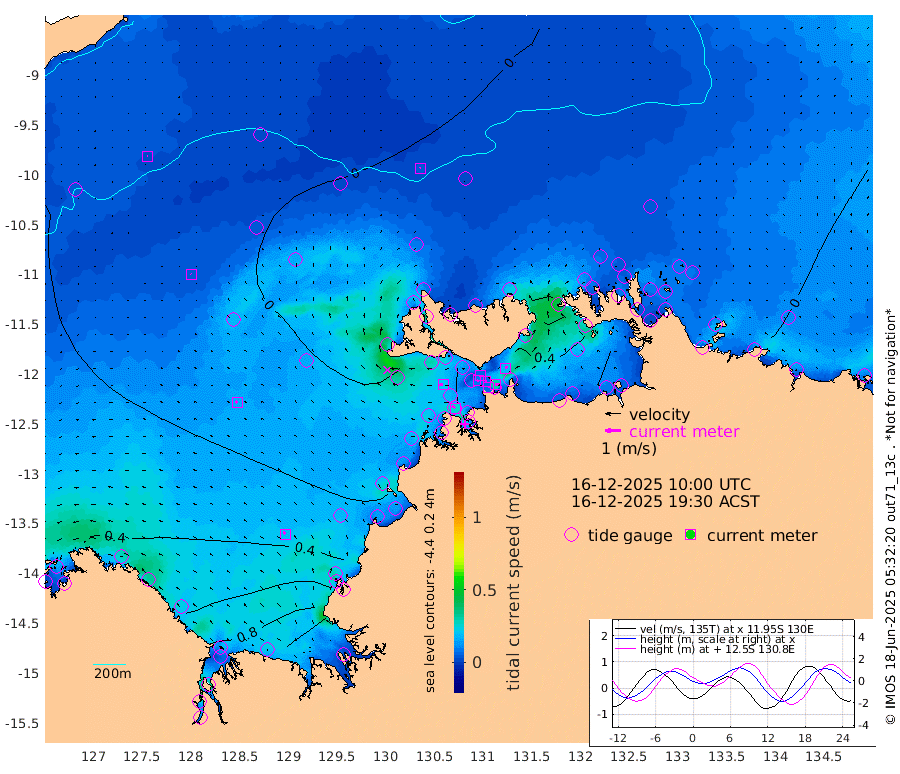 7cm/s 88T +4cm/s rms + 6cm/s 51T. Darwin_C1 52m 29cm/s 88T +4cm/s rms + 7cm/s -161T. Darwin_CW1 22m 8cm/s -113T +4cm/s rms + 8cm/s 61T. Darwin_CW2 34m 19cm/s 30T +3cm/s rms + 9cm/s 98T. Darwin_CW3 22m 7cm/s 114T +5cm/s rms + 7cm/s 88T. Darwin_C3 56m 7cm/s -120T +2cm/s rms + 9cm/s -126T. Darwin_CTbW 22m 4cm/s 2T +9cm/s rms + 2cm/s -110T. NWSLYN 196m 22cm/s -81T +1cm/s rms + 1cm/s -47T. DARBGF 30m 2cm/s -55T +7cm/s rms + 2cm/s -137T. ITFTIS 464m 4cm/s -21T +9cm/s rms + 1cm/s 74T. ITFMHB 146m 18cm/s -31T +4cm/s rms + 1cm/s -134T. ITFJBG 61m 17cm/s -44T +6cm/s rms + 4cm/s 121T. ITFFTB 108m 26cm/s -56T +4cm/s rms + 3cm/s 80T. NRSDAR 19m 79cm Carronade Island 84cm Guy Point 76cm Napier Broome Bay 83cm Lesueur Island 86cm Reveley Island 35cm Rocky Island 111cm Cape Domett 109cm Lacrosse Island 130cm Adolphus Island 157cm Pender Point 172cm Wyndham 19cm The Boxers 1cm Unnamed Shoal 19cm Loxton Shoal 92cm Pelican Island 19cm Calder Shoal 11cm Evans Shoal 155cm Quoin Island 69cm Port Keats 66cm Jones Point 134cm Catfish Island 33cm Cape Scott Offshore 64cm Cape Ford 23cm Anson Bay 1cm Goodrich Bank 30cm Peron Island North 21cm Point Jenny 19cm Native Point 27cm Fish Reef 24cm Tapa Bay 9cm Point Fawcett (Offshore) 39cm Burge Point 15cm Munkunuwa 23cm Beagle A 24cm Parsons Bank 35cm Fenton Patches 3cm Lynedoch Bank 31cm Hancox Shoal Area 31cm Nightcliff 37cm Darwin 31cm Charles Point Patches 51cm Glyde Point 72cm Chambers Bay 84cm Point Stuart 60cm Cape Hotham 71cm Christine Reef 95cm West Alligator Head 112cm East Field Island 61cm Two Hills Bay 32cm Newby Shoal 60cm Camp Point 24cm Medina Inlet South -2cm South Barlow Point 2cm St. Asaph Bay -3cm Cape Van Dieman -4cm Snake Bay 4cm Cache Point 29cm Echo Shoal 8cm Point Jahleel (Off) 16cm Cape Don -1cm Port Essington -3cm Smith Point - West -3cm NW Peacock Island 1cm North Of Jones Shoal -1cm Peacock Island -6cm Point David -7cm D'urville Point -2cm Money Shoal -6cm Copeland Island 0cm Cape Cockburn -2cm One Tree Point 5cm Hogmany Shoal -1cm New Year Island - West -2cm Grant Island -4cm Aurari Bay 2cm Cuthbert Point -1cm North Goulburn Island 10cm Paxie Shoal 11cm Entrance Island 19cm Yabooma Island