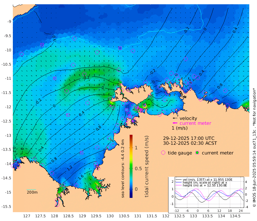 60cm/s 78T +4cm/s rms + 6cm/s 51T. Darwin_C1 52m 40cm/s 88T +4cm/s rms + 7cm/s -161T. Darwin_CW1 22m 36cm/s 72T +4cm/s rms + 8cm/s 61T. Darwin_CW2 34m 41cm/s 45T +3cm/s rms + 9cm/s 98T. Darwin_CW3 22m 64cm/s 90T +5cm/s rms + 7cm/s 88T. Darwin_C3 56m 34cm/s 64T +2cm/s rms + 9cm/s -126T. Darwin_CTbW 22m 8cm/s -24T +9cm/s rms + 2cm/s -110T. NWSLYN 196m 16cm/s -72T +1cm/s rms + 1cm/s -47T. DARBGF 30m 7cm/s -68T +7cm/s rms + 2cm/s -137T. ITFTIS 464m 14cm/s -29T +9cm/s rms + 1cm/s 74T. ITFMHB 146m 13cm/s -60T +4cm/s rms + 1cm/s -134T. ITFJBG 61m 23cm/s -57T +6cm/s rms + 4cm/s 121T. ITFFTB 108m 22cm/s -43T +4cm/s rms + 3cm/s 80T. NRSDAR 19m -18cm Carronade Island -25cm Guy Point -11cm Napier Broome Bay 34cm Lesueur Island 91cm Reveley Island 56cm Rocky Island 147cm Cape Domett 132cm Lacrosse Island 160cm Adolphus Island 159cm Pender Point 164cm Wyndham -18cm The Boxers 11cm Unnamed Shoal -64cm Loxton Shoal 148cm Pelican Island -38cm Calder Shoal -59cm Evans Shoal 200cm Quoin Island 128cm Port Keats 130cm Jones Point 187cm Catfish Island 69cm Cape Scott Offshore 23cm Cape Ford 80cm Anson Bay -44cm Goodrich Bank 61cm Peron Island North 62cm Point Jenny 63cm Native Point 68cm Fish Reef 77cm Tapa Bay -6cm Point Fawcett (Offshore) 96cm Burge Point 64cm Munkunuwa 47cm Beagle A 94cm Parsons Bank 92cm Fenton Patches -41cm Lynedoch Bank 97cm Hancox Shoal Area 103cm Nightcliff 108cm Darwin 79cm Charles Point Patches 104cm Glyde Point 116cm Chambers Bay 126cm Point Stuart 101cm Cape Hotham 108cm Christine Reef 139cm West Alligator Head 147cm East Field Island 96cm Two Hills Bay 25cm Newby Shoal 94cm Camp Point 72cm Medina Inlet South -11cm South Barlow Point -31cm St. Asaph Bay -42cm Cape Van Dieman -35cm Snake Bay -38cm Cache Point -73cm Echo Shoal -18cm Point Jahleel (Off) 27cm Cape Don -12cm Port Essington -13cm Smith Point - West -10cm NW Peacock Island -29cm North Of Jones Shoal -8cm Peacock Island 20cm Point David -6cm D'urville Point -9cm Money Shoal 23cm Copeland Island 29cm Cape Cockburn 14cm One Tree Point 28cm Hogmany Shoal 22cm New Year Island - West 25cm Grant Island 48cm Aurari Bay 65cm Cuthbert Point 42cm North Goulburn Island 78cm Paxie Shoal 100cm Entrance Island 123cm Yabooma Island