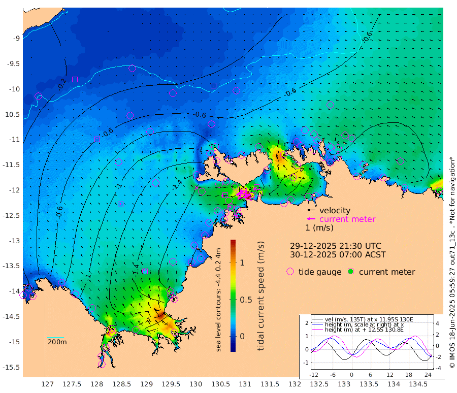 130cm/s -102T +4cm/s rms + 6cm/s 51T. Darwin_C1 52m 81cm/s -90T +4cm/s rms + 7cm/s -161T. Darwin_CW1 22m 81cm/s -106T +4cm/s rms + 8cm/s 61T. Darwin_CW2 34m 52cm/s -132T +3cm/s rms + 9cm/s 98T. Darwin_CW3 22m 116cm/s -91T +5cm/s rms + 7cm/s 88T. Darwin_C3 56m 82cm/s -116T +2cm/s rms + 9cm/s -126T. Darwin_CTbW 22m 3cm/s -123T +9cm/s rms + 2cm/s -110T. NWSLYN 196m 44cm/s -94T +1cm/s rms + 1cm/s -47T. DARBGF 30m 2cm/s 124T +7cm/s rms + 2cm/s -137T. ITFTIS 464m 10cm/s 0T +9cm/s rms + 1cm/s 74T. ITFMHB 146m 22cm/s -10T +4cm/s rms + 1cm/s -134T. ITFJBG 61m 16cm/s -33T +6cm/s rms + 4cm/s 121T. ITFFTB 108m 37cm/s -64T +4cm/s rms + 3cm/s 80T. NRSDAR 19m -11cm Carronade Island -10cm Guy Point -6cm Napier Broome Bay -82cm Lesueur Island -127cm Reveley Island -65cm Rocky Island -155cm Cape Domett -150cm Lacrosse Island -140cm Adolphus Island -61cm Pender Point -44cm Wyndham -77cm The Boxers -87cm Unnamed Shoal -26cm Loxton Shoal -174cm Pelican Island -73cm Calder Shoal -41cm Evans Shoal -126cm Quoin Island -189cm Port Keats -181cm Jones Point -106cm Catfish Island -170cm Cape Scott Offshore -223cm Cape Ford -185cm Anson Bay -57cm Goodrich Bank -181cm Peron Island North -187cm Point Jenny -186cm Native Point -190cm Fish Reef -197cm Tapa Bay -131cm Point Fawcett (Offshore) -203cm Burge Point -180cm Munkunuwa -177cm Beagle A -196cm Parsons Bank -203cm Fenton Patches -40cm Lynedoch Bank -191cm Hancox Shoal Area -203cm Nightcliff -204cm Darwin -197cm Charles Point Patches -145cm Glyde Point -101cm Chambers Bay -86cm Point Stuart -121cm Cape Hotham -99cm Christine Reef -86cm West Alligator Head -64cm East Field Island -98cm Two Hills Bay -143cm Newby Shoal -90cm Camp Point -187cm Medina Inlet South -114cm South Barlow Point -95cm St. Asaph Bay -62cm Cape Van Dieman -65cm Snake Bay -68cm Cache Point -11cm Echo Shoal -73cm Point Jahleel (Off) -93cm Cape Don -74cm Port Essington -82cm Smith Point - West -76cm NW Peacock Island -63cm North Of Jones Shoal -23cm Peacock Island -76cm Point David -82cm D'urville Point -61cm Money Shoal -76cm Copeland Island -104cm Cape Cockburn -75cm One Tree Point -98cm Hogmany Shoal -78cm New Year Island - West -82cm Grant Island -81cm Aurari Bay -90cm Cuthbert Point -87cm North Goulburn Island -76cm Paxie Shoal -95cm Entrance Island -87cm Yabooma Island