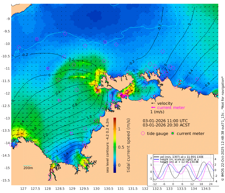 121cm/s 79T +4cm/s rms + 6cm/s 51T. Darwin_C1 52m 128cm/s 90T +4cm/s rms + 7cm/s -161T. Darwin_CW1 22m 70cm/s 71T +4cm/s rms + 8cm/s 61T. Darwin_CW2 34m 87cm/s 45T +3cm/s rms + 9cm/s 98T. Darwin_CW3 22m 127cm/s 90T +5cm/s rms + 7cm/s 88T. Darwin_C3 56m 58cm/s 66T +2cm/s rms + 9cm/s -126T. Darwin_CTbW 22m 8cm/s 4T +9cm/s rms + 2cm/s -110T. NWSLYN 196m 23cm/s -64T +1cm/s rms + 1cm/s -47T. DARBGF 30m 7cm/s -66T +7cm/s rms + 2cm/s -137T. ITFTIS 464m 10cm/s -54T +9cm/s rms + 1cm/s 74T. ITFMHB 146m 26cm/s -51T +4cm/s rms + 1cm/s -134T. ITFJBG 61m 32cm/s -56T +6cm/s rms + 4cm/s 121T. ITFFTB 108m 40cm/s -47T +4cm/s rms + 3cm/s 80T. NRSDAR 19m 75cm Carronade Island 85cm Guy Point 80cm Napier Broome Bay 137cm Lesueur Island 212cm Reveley Island 116cm Rocky Island 309cm Cape Domett 282cm Lacrosse Island 345cm Adolphus Island 354cm Pender Point 360cm Wyndham 34cm The Boxers 10cm Unnamed Shoal -7cm Loxton Shoal 296cm Pelican Island 17cm Calder Shoal -14cm Evans Shoal 409cm Quoin Island 259cm Port Keats 237cm Jones Point 345cm Catfish Island 156cm Cape Scott Offshore 149cm Cape Ford 160cm Anson Bay -16cm Goodrich Bank 136cm Peron Island North 135cm Point Jenny 132cm Native Point 140cm Fish Reef 156cm Tapa Bay 49cm Point Fawcett (Offshore) 181cm Burge Point 131cm Munkunuwa 112cm Beagle A 161cm Parsons Bank 170cm Fenton Patches -16cm Lynedoch Bank 175cm Hancox Shoal Area 185cm Nightcliff 195cm Darwin 169cm Charles Point Patches 177cm Glyde Point 200cm Chambers Bay 199cm Point Stuart 167cm Cape Hotham 190cm Christine Reef 221cm West Alligator Head 238cm East Field Island 155cm Two Hills Bay 91cm Newby Shoal 162cm Camp Point 149cm Medina Inlet South 27cm South Barlow Point 12cm St. Asaph Bay -19cm Cape Van Dieman -17cm Snake Bay -9cm Cache Point -12cm Echo Shoal 10cm Point Jahleel (Off) 60cm Cape Don 4cm Port Essington 2cm Smith Point - West -1cm NW Peacock Island -7cm North Of Jones Shoal -3cm Peacock Island 7cm Point David -3cm D'urville Point -1cm Money Shoal 9cm Copeland Island 19cm Cape Cockburn 11cm One Tree Point 25cm Hogmany Shoal 15cm New Year Island - West 18cm Grant Island 27cm Aurari Bay 50cm Cuthbert Point 32cm North Goulburn Island 72cm Paxie Shoal 82cm Entrance Island 102cm Yabooma Island
