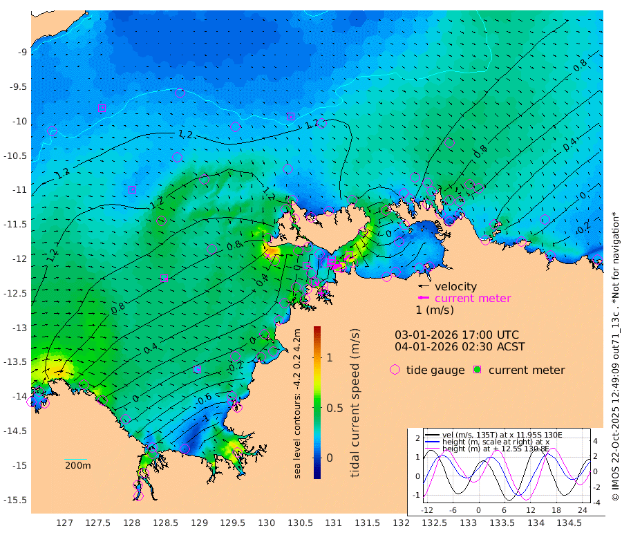 64cm/s -101T +4cm/s rms + 6cm/s 51T. Darwin_C1 52m 74cm/s -91T +4cm/s rms + 7cm/s -161T. Darwin_CW1 22m 27cm/s -109T +4cm/s rms + 8cm/s 61T. Darwin_CW2 34m 64cm/s -137T +3cm/s rms + 9cm/s 98T. Darwin_CW3 22m 58cm/s -91T +5cm/s rms + 7cm/s 88T. Darwin_C3 56m 18cm/s -113T +2cm/s rms + 9cm/s -126T. Darwin_CTbW 22m 14cm/s 144T +9cm/s rms + 2cm/s -110T. NWSLYN 196m 34cm/s 100T +1cm/s rms + 1cm/s -47T. DARBGF 30m 13cm/s 41T +7cm/s rms + 2cm/s -137T. ITFTIS 464m 13cm/s 73T +9cm/s rms + 1cm/s 74T. ITFMHB 146m 21cm/s 110T +4cm/s rms + 1cm/s -134T. ITFJBG 61m 31cm/s 105T +6cm/s rms + 4cm/s 121T. ITFFTB 108m 36cm/s 134T +4cm/s rms + 3cm/s 80T. NRSDAR 19m 65cm Carronade Island 60cm Guy Point 74cm Napier Broome Bay 25cm Lesueur Island -68cm Reveley Island -37cm Rocky Island -133cm Cape Domett -111cm Lacrosse Island -169cm Adolphus Island -174cm Pender Point -172cm Wyndham 93cm The Boxers 100cm Unnamed Shoal 112cm Loxton Shoal -139cm Pelican Island 99cm Calder Shoal 102cm Evans Shoal -221cm Quoin Island -95cm Port Keats -96cm Jones Point -157cm Catfish Island -18cm Cape Scott Offshore 21cm Cape Ford -19cm Anson Bay 103cm Goodrich Bank -1cm Peron Island North 1cm Point Jenny 3cm Native Point -5cm Fish Reef -16cm Tapa Bay 72cm Point Fawcett (Offshore) -32cm Burge Point -19cm Munkunuwa 20cm Beagle A -34cm Parsons Bank -30cm Fenton Patches 99cm Lynedoch Bank -45cm Hancox Shoal Area -46cm Nightcliff -43cm Darwin -11cm Charles Point Patches -53cm Glyde Point -91cm Chambers Bay -98cm Point Stuart -58cm Cape Hotham -80cm Christine Reef -118cm West Alligator Head -134cm East Field Island -54cm Two Hills Bay 68cm Newby Shoal -51cm Camp Point -10cm Medina Inlet South 78cm South Barlow Point 88cm St. Asaph Bay 105cm Cape Van Dieman 107cm Snake Bay 102cm Cache Point 109cm Echo Shoal 78cm Point Jahleel (Off) 39cm Cape Don 82cm Port Essington 80cm Smith Point - West 82cm NW Peacock Island 94cm North Of Jones Shoal 32cm Peacock Island 64cm Point David 81cm D'urville Point 86cm Money Shoal 57cm Copeland Island 77cm Cape Cockburn 69cm One Tree Point 70cm Hogmany Shoal 68cm New Year Island - West 63cm Grant Island 37cm Aurari Bay 23cm Cuthbert Point 44cm North Goulburn Island 9cm Paxie Shoal -15cm Entrance Island -46cm Yabooma Island