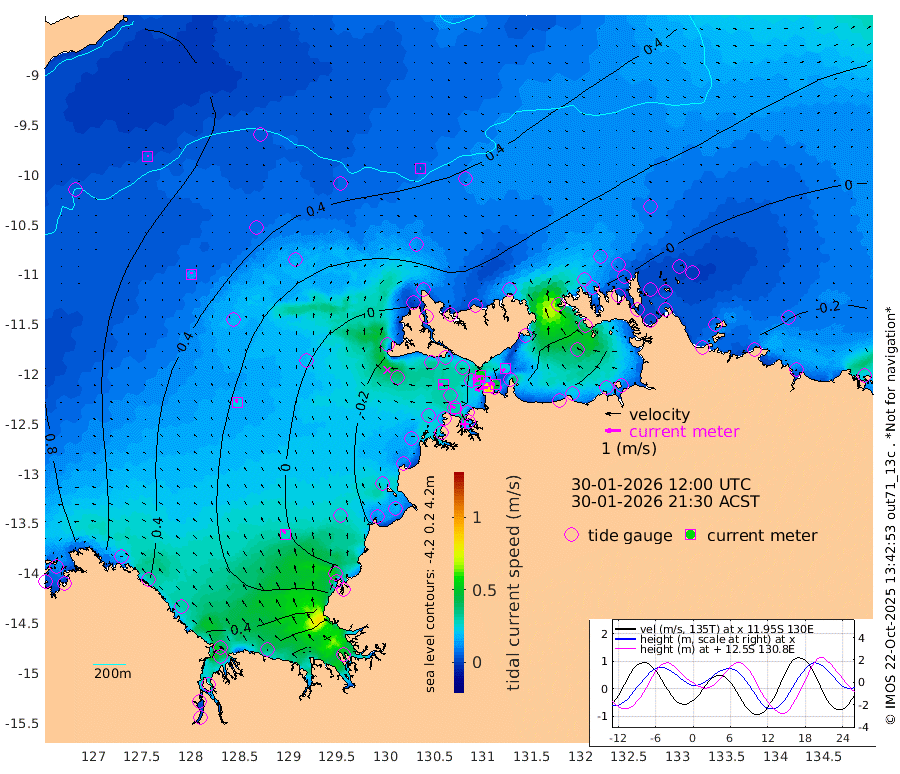 83cm/s -103T +4cm/s rms + 6cm/s 51T. Darwin_C1 52m 44cm/s -87T +4cm/s rms + 7cm/s -161T. Darwin_CW1 22m 36cm/s -111T +4cm/s rms + 8cm/s 61T. Darwin_CW2 34m 23cm/s -118T +3cm/s rms + 9cm/s 98T. Darwin_CW3 22m 23cm/s -94T +5cm/s rms + 7cm/s 88T. Darwin_C3 56m 55cm/s -116T +2cm/s rms + 9cm/s -126T. Darwin_CTbW 22m 5cm/s 101T +9cm/s rms + 2cm/s -110T. NWSLYN 196m 31cm/s -86T +1cm/s rms + 1cm/s -47T. DARBGF 30m 7cm/s 11T +7cm/s rms + 2cm/s -137T. ITFTIS 464m 14cm/s 13T +9cm/s rms + 1cm/s 74T. ITFMHB 146m 29cm/s -22T +4cm/s rms + 1cm/s -134T. ITFJBG 61m 23cm/s -25T +6cm/s rms + 4cm/s 121T. ITFFTB 108m 31cm/s -60T +4cm/s rms + 3cm/s 80T. NRSDAR 19m 119cm Carronade Island 127cm Guy Point 126cm Napier Broome Bay 92cm Lesueur Island 42cm Reveley Island 26cm Rocky Island 56cm Cape Domett 51cm Lacrosse Island 87cm Adolphus Island 136cm Pender Point 159cm Wyndham 51cm The Boxers 19cm Unnamed Shoal 78cm Loxton Shoal 26cm Pelican Island 51cm Calder Shoal 52cm Evans Shoal 99cm Quoin Island 7cm Port Keats -10cm Jones Point 80cm Catfish Island -8cm Cape Scott Offshore -18cm Cape Ford -22cm Anson Bay 37cm Goodrich Bank -18cm Peron Island North -28cm Point Jenny -27cm Native Point -32cm Fish Reef -30cm Tapa Bay 2cm Point Fawcett (Offshore) -27cm Burge Point -44cm Munkunuwa -19cm Beagle A -37cm Parsons Bank -29cm Fenton Patches 47cm Lynedoch Bank -26cm Hancox Shoal Area -30cm Nightcliff -22cm Darwin -11cm Charles Point Patches 1cm Glyde Point 33cm Chambers Bay 28cm Point Stuart 8cm Cape Hotham 30cm Christine Reef 31cm West Alligator Head 52cm East Field Island 20cm Two Hills Bay 29cm Newby Shoal 32cm Camp Point -25cm Medina Inlet South 5cm South Barlow Point 17cm St. Asaph Bay 30cm Cape Van Dieman 32cm Snake Bay 33cm Cache Point 88cm Echo Shoal 27cm Point Jahleel (Off) 16cm Cape Don 21cm Port Essington 16cm Smith Point - West 19cm NW Peacock Island 32cm North Of Jones Shoal 9cm Peacock Island 7cm Point David 12cm D'urville Point 29cm Money Shoal 4cm Copeland Island 9cm Cape Cockburn 14cm One Tree Point 14cm Hogmany Shoal 16cm New Year Island - West 12cm Grant Island -3cm Aurari Bay -2cm Cuthbert Point 5cm North Goulburn Island 7cm Paxie Shoal -3cm Entrance Island -7cm Yabooma Island