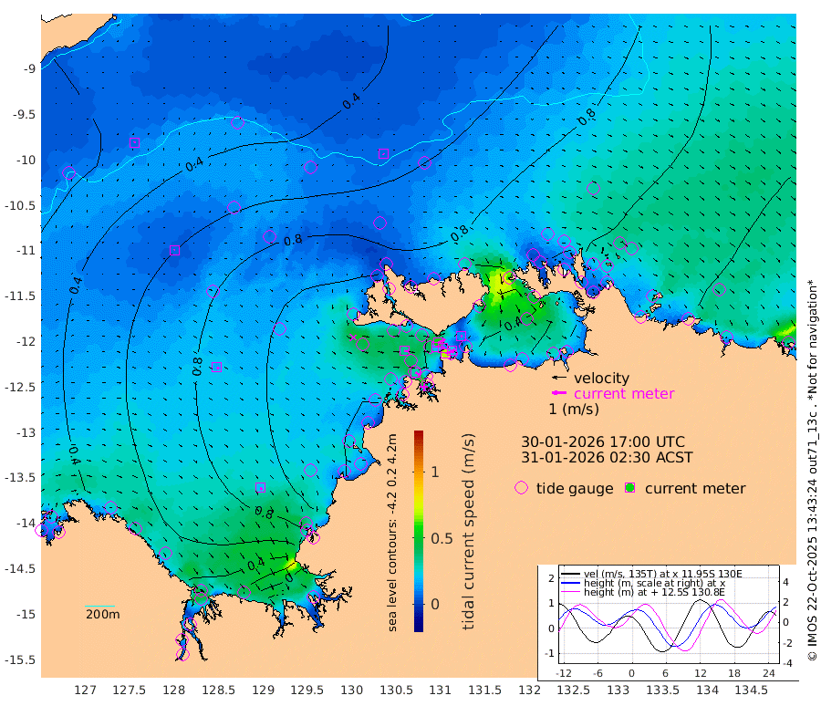 67cm/s 78T +4cm/s rms + 6cm/s 51T. Darwin_C1 52m 24cm/s 76T +4cm/s rms + 7cm/s -161T. Darwin_CW1 22m 19cm/s 79T +4cm/s rms + 8cm/s 61T. Darwin_CW2 34m 11cm/s 70T +3cm/s rms + 9cm/s 98T. Darwin_CW3 22m 13cm/s 88T +5cm/s rms + 7cm/s 88T. Darwin_C3 56m 54cm/s 62T +2cm/s rms + 9cm/s -126T. Darwin_CTbW 22m 6cm/s 138T +9cm/s rms + 2cm/s -110T. NWSLYN 196m 32cm/s 93T +1cm/s rms + 1cm/s -47T. DARBGF 30m 7cm/s 9T +7cm/s rms + 2cm/s -137T. ITFTIS 464m 6cm/s 46T +9cm/s rms + 1cm/s 74T. ITFMHB 146m 20cm/s 144T +4cm/s rms + 1cm/s -134T. ITFJBG 61m 17cm/s 120T +6cm/s rms + 4cm/s 121T. ITFFTB 108m 30cm/s 123T +4cm/s rms + 3cm/s 80T. NRSDAR 19m -13cm Carronade Island -23cm Guy Point -11cm Napier Broome Bay 14cm Lesueur Island 10cm Reveley Island -7cm Rocky Island -5cm Cape Domett 1cm Lacrosse Island -34cm Adolphus Island -78cm Pender Point -86cm Wyndham 52cm The Boxers 84cm Unnamed Shoal 20cm Loxton Shoal 12cm Pelican Island 43cm Calder Shoal 33cm Evans Shoal -54cm Quoin Island 40cm Port Keats 48cm Jones Point -1cm Catfish Island 62cm Cape Scott Offshore 96cm Cape Ford 76cm Anson Bay 51cm Goodrich Bank 81cm Peron Island North 82cm Point Jenny 81cm Native Point 87cm Fish Reef 81cm Tapa Bay 77cm Point Fawcett (Offshore) 80cm Burge Point 72cm Munkunuwa 80cm Beagle A 84cm Parsons Bank 78cm Fenton Patches 43cm Lynedoch Bank 73cm Hancox Shoal Area 71cm Nightcliff 82cm Darwin 87cm Charles Point Patches 53cm Glyde Point 11cm Chambers Bay 13cm Point Stuart 42cm Cape Hotham 12cm Christine Reef 4cm West Alligator Head -15cm East Field Island 34cm Two Hills Bay 75cm Newby Shoal 25cm Camp Point 81cm Medina Inlet South 74cm South Barlow Point 61cm St. Asaph Bay 57cm Cape Van Dieman 63cm Snake Bay 59cm Cache Point 7cm Echo Shoal 56cm Point Jahleel (Off) 64cm Cape Don 72cm Port Essington 72cm Smith Point - West 74cm NW Peacock Island 62cm North Of Jones Shoal 24cm Peacock Island 85cm Point David 79cm D'urville Point 72cm Money Shoal 84cm Copeland Island 110cm Cape Cockburn 82cm One Tree Point 104cm Hogmany Shoal 85cm New Year Island - West 87cm Grant Island 87cm Aurari Bay 93cm Cuthbert Point 89cm North Goulburn Island 82cm Paxie Shoal 83cm Entrance Island 78cm Yabooma Island
