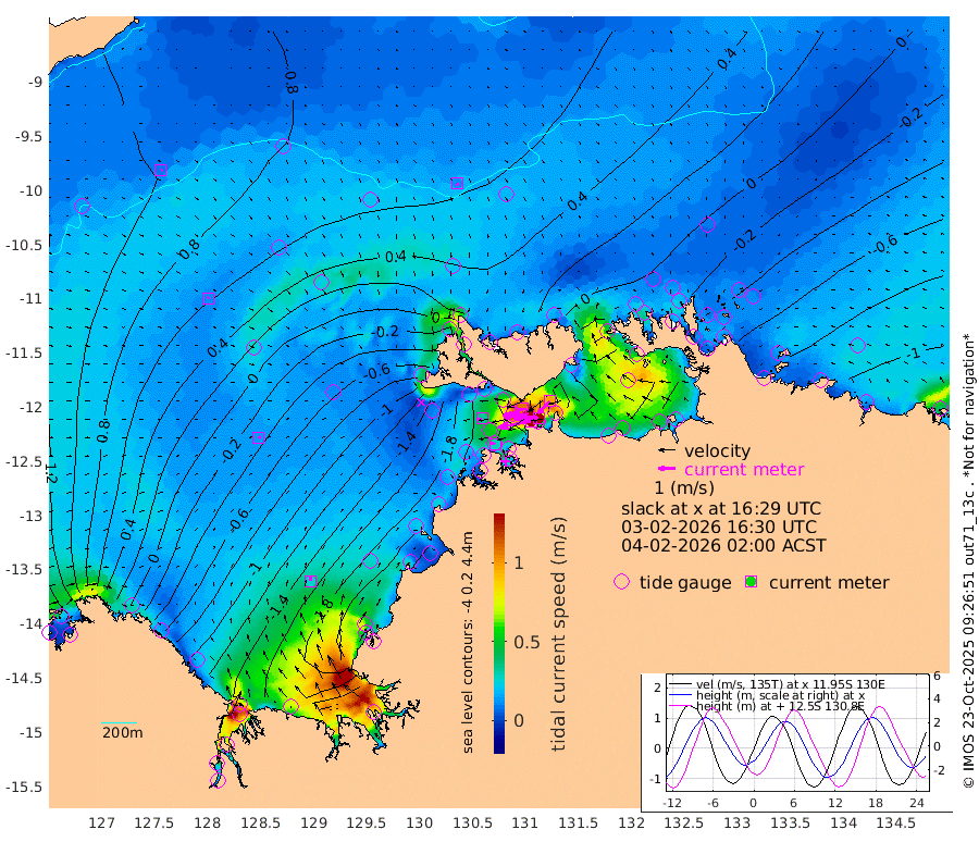 196cm/s -101T +4cm/s rms + 6cm/s 51T. Darwin_C1 52m 150cm/s -91T +4cm/s rms + 7cm/s -161T. Darwin_CW1 22m 98cm/s -106T +4cm/s rms + 8cm/s 61T. Darwin_CW2 34m 95cm/s -135T +3cm/s rms + 9cm/s 98T. Darwin_CW3 22m 145cm/s -91T +5cm/s rms + 7cm/s 88T. Darwin_C3 56m 107cm/s -116T +2cm/s rms + 9cm/s -126T. Darwin_CTbW 22m 11cm/s 155T +9cm/s rms + 2cm/s -110T. NWSLYN 196m 32cm/s -99T +1cm/s rms + 1cm/s -47T. DARBGF 30m 9cm/s 57T +7cm/s rms + 2cm/s -137T. ITFTIS 464m 12cm/s 53T +9cm/s rms + 1cm/s 74T. ITFMHB 146m 25cm/s 9T +4cm/s rms + 1cm/s -134T. ITFJBG 61m 14cm/s 50T +6cm/s rms + 4cm/s 121T. ITFFTB 108m 27cm/s -78T +4cm/s rms + 3cm/s 80T. NRSDAR 19m 132cm Carronade Island 137cm Guy Point 145cm Napier Broome Bay 7cm Lesueur Island -126cm Reveley Island -64cm Rocky Island -207cm Cape Domett -182cm Lacrosse Island -212cm Adolphus Island -111cm Pender Point -77cm Wyndham 23cm The Boxers 3cm Unnamed Shoal 93cm Loxton Shoal -245cm Pelican Island 35cm Calder Shoal 61cm Evans Shoal -245cm Quoin Island -246cm Port Keats -247cm Jones Point -168cm Catfish Island -168cm Cape Scott Offshore -208cm Cape Ford -195cm Anson Bay 36cm Goodrich Bank -178cm Peron Island North -172cm Point Jenny -169cm Native Point -196cm Fish Reef -200cm Tapa Bay -66cm Point Fawcett (Offshore) -223cm Burge Point -198cm Munkunuwa -148cm Beagle A -224cm Parsons Bank -216cm Fenton Patches 50cm Lynedoch Bank -216cm Hancox Shoal Area -225cm Nightcliff -242cm Darwin -210cm Charles Point Patches -171cm Glyde Point -127cm Chambers Bay -124cm Point Stuart -145cm Cape Hotham -113cm Christine Reef -134cm West Alligator Head -115cm East Field Island -110cm Two Hills Bay -62cm Newby Shoal -102cm Camp Point -199cm Medina Inlet South -52cm South Barlow Point -16cm St. Asaph Bay 31cm Cape Van Dieman 25cm Snake Bay 26cm Cache Point 116cm Echo Shoal 2cm Point Jahleel (Off) -51cm Cape Don -9cm Port Essington -12cm Smith Point - West -6cm NW Peacock Island 17cm North Of Jones Shoal 3cm Peacock Island -27cm Point David -15cm D'urville Point 6cm Money Shoal -33cm Copeland Island -46cm Cape Cockburn -24cm One Tree Point -33cm Hogmany Shoal -22cm New Year Island - West -30cm Grant Island -58cm Aurari Bay -72cm Cuthbert Point -53cm North Goulburn Island -68cm Paxie Shoal -97cm Entrance Island -118cm Yabooma Island