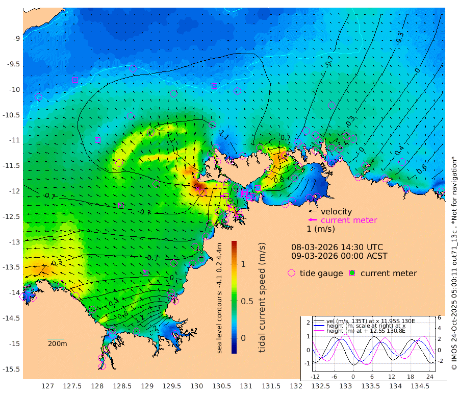 18cm/s -106T +4cm/s rms + 6cm/s 51T. Darwin_C1 52m 10cm/s -79T +4cm/s rms + 7cm/s -161T. Darwin_CW1 22m 22cm/s -106T +4cm/s rms + 8cm/s 61T. Darwin_CW2 34m 16cm/s 35T +3cm/s rms + 9cm/s 98T. Darwin_CW3 22m 6cm/s -126T +5cm/s rms + 7cm/s 88T. Darwin_C3 56m 16cm/s -116T +2cm/s rms + 9cm/s -126T. Darwin_CTbW 22m 11cm/s -38T +9cm/s rms + 2cm/s -110T. NWSLYN 196m 69cm/s -86T +1cm/s rms + 1cm/s -47T. DARBGF 30m 11cm/s -109T +7cm/s rms + 2cm/s -137T. ITFTIS 464m 21cm/s -36T +9cm/s rms + 1cm/s 74T. ITFMHB 146m 43cm/s -35T +4cm/s rms + 1cm/s -134T. ITFJBG 61m 50cm/s -55T +6cm/s rms + 4cm/s 121T. ITFFTB 108m 78cm/s -55T +4cm/s rms + 3cm/s 80T. NRSDAR 19m 9cm Carronade Island 6cm Guy Point 16cm Napier Broome Bay 5cm Lesueur Island 39cm Reveley Island 44cm Rocky Island 103cm Cape Domett 79cm Lacrosse Island 165cm Adolphus Island 231cm Pender Point 268cm Wyndham -83cm The Boxers -88cm Unnamed Shoal -91cm Loxton Shoal 90cm Pelican Island -107cm Calder Shoal -90cm Evans Shoal 241cm Quoin Island 13cm Port Keats 29cm Jones Point 315cm Catfish Island -54cm Cape Scott Offshore -154cm Cape Ford -64cm Anson Bay -99cm Goodrich Bank -64cm Peron Island North -87cm Point Jenny -91cm Native Point -73cm Fish Reef -81cm Tapa Bay -115cm Point Fawcett (Offshore) -63cm Burge Point -91cm Munkunuwa -99cm Beagle A -49cm Parsons Bank -66cm Fenton Patches -79cm Lynedoch Bank -37cm Hancox Shoal Area -58cm Nightcliff -37cm Darwin -65cm Charles Point Patches 32cm Glyde Point 117cm Chambers Bay 150cm Point Stuart 60cm Cape Hotham 100cm Christine Reef 174cm West Alligator Head 212cm East Field Island 89cm Two Hills Bay -94cm Newby Shoal 71cm Camp Point -75cm Medina Inlet South -117cm South Barlow Point -121cm St. Asaph Bay -105cm Cape Van Dieman -102cm Snake Bay -92cm Cache Point -79cm Echo Shoal -71cm Point Jahleel (Off) -20cm Cape Don -56cm Port Essington -62cm Smith Point - West -54cm NW Peacock Island -69cm North Of Jones Shoal -22cm Peacock Island -22cm Point David -54cm D'urville Point -44cm Money Shoal -15cm Copeland Island -15cm Cape Cockburn -23cm One Tree Point -9cm Hogmany Shoal -20cm New Year Island - West -15cm Grant Island 15cm Aurari Bay 48cm Cuthbert Point 10cm North Goulburn Island 60cm Paxie Shoal 87cm Entrance Island 134cm Yabooma Island