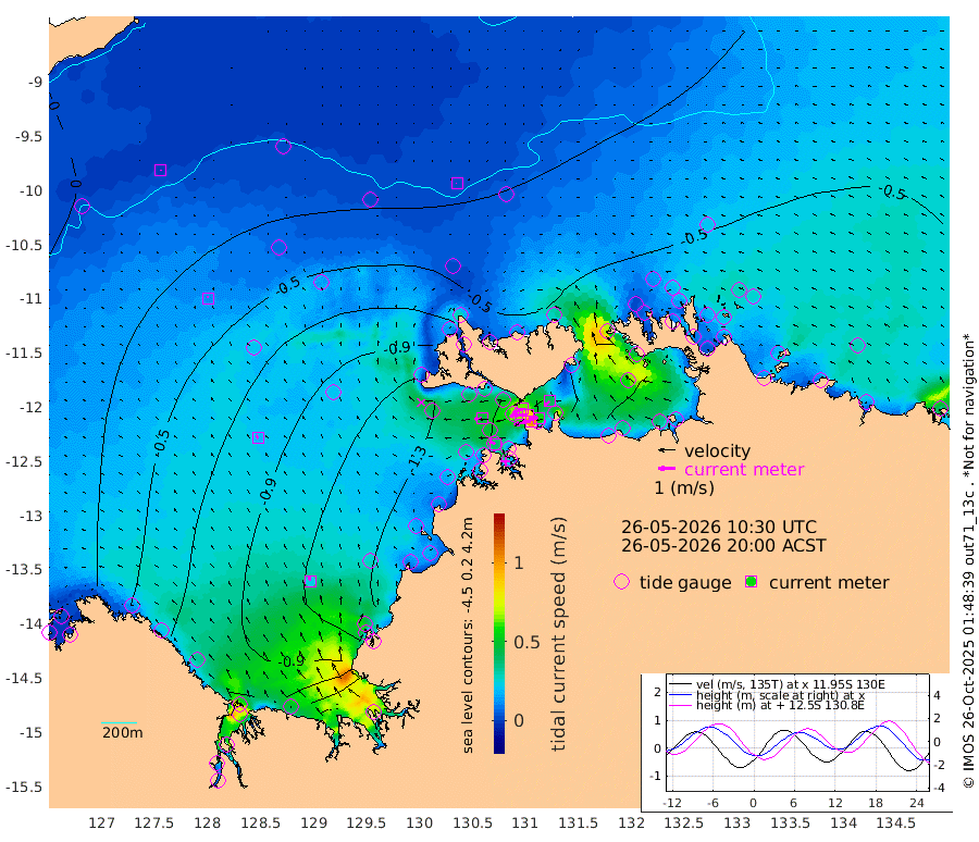 101cm/s -101T +4cm/s rms + 6cm/s 51T. Darwin_C1 52m 57cm/s -90T +4cm/s rms + 7cm/s -161T. Darwin_CW1 22m 65cm/s -107T +4cm/s rms + 8cm/s 61T. Darwin_CW2 34m 40cm/s -131T +3cm/s rms + 9cm/s 98T. Darwin_CW3 22m 86cm/s -91T +5cm/s rms + 7cm/s 88T. Darwin_C3 56m 63cm/s -115T +2cm/s rms + 9cm/s -126T. Darwin_CTbW 22m 2cm/s -165T +9cm/s rms + 2cm/s -110T. NWSLYN 196m 44cm/s -92T +1cm/s rms + 1cm/s -47T. DARBGF 30m 1cm/s 27T +7cm/s rms + 2cm/s -137T. ITFTIS 464m 11cm/s -3T +9cm/s rms + 1cm/s 74T. ITFMHB 146m 24cm/s -16T +4cm/s rms + 1cm/s -134T. ITFJBG 61m 19cm/s -37T +6cm/s rms + 4cm/s 121T. ITFFTB 108m 38cm/s -62T +4cm/s rms + 3cm/s 80T. NRSDAR 19m 8cm Carronade Island 14cm Guy Point 13cm Napier Broome Bay -50cm Lesueur Island -86cm Reveley Island -50cm Rocky Island -109cm Cape Domett -111cm Lacrosse Island -94cm Adolphus Island -20cm Pender Point -9cm Wyndham -54cm The Boxers -60cm Unnamed Shoal -8cm Loxton Shoal -127cm Pelican Island -51cm Calder Shoal -25cm Evans Shoal -94cm Quoin Island -145cm Port Keats -141cm Jones Point -135cm Catfish Island -137cm Cape Scott Offshore -156cm Cape Ford -152cm Anson Bay -35cm Goodrich Bank -149cm Peron Island North -148cm Point Jenny -144cm Native Point -162cm Fish Reef -153cm Tapa Bay -108cm Point Fawcett (Offshore) -161cm Burge Point -143cm Munkunuwa -144cm Beagle A -152cm Parsons Bank -163cm Fenton Patches -23cm Lynedoch Bank -145cm Hancox Shoal Area -162cm Nightcliff -161cm Darwin -155cm Charles Point Patches -113cm Glyde Point -80cm Chambers Bay -69cm Point Stuart -97cm Cape Hotham -71cm Christine Reef -70cm West Alligator Head -52cm East Field Island -79cm Two Hills Bay -110cm Newby Shoal -65cm Camp Point -152cm Medina Inlet South -89cm South Barlow Point -73cm St. Asaph Bay -40cm Cape Van Dieman -43cm Snake Bay -48cm Cache Point -2cm Echo Shoal -52cm Point Jahleel (Off) -71cm Cape Don -54cm Port Essington -60cm Smith Point - West -53cm NW Peacock Island -48cm North Of Jones Shoal -18cm Peacock Island -49cm Point David -58cm D'urville Point -42cm Money Shoal -50cm Copeland Island -76cm Cape Cockburn -54cm One Tree Point -58cm Hogmany Shoal -53cm New Year Island - West -53cm Grant Island -61cm Aurari Bay -63cm Cuthbert Point -62cm North Goulburn Island -50cm Paxie Shoal -64cm Entrance Island -64cm Yabooma Island