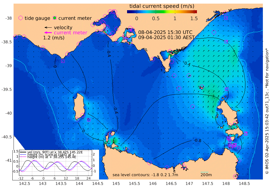 15cm/s 121T +9cm/s rms + 16cm/s 128T. CWTb1 63m 10cm/s 113T +8cm/s rms + 14cm/s 130T. C1A1 56m 14cm/s -83T +8cm/s rms + 12cm/s 12T. C1A3 27m 12cm/s 143T +0cm/s rms + 0cm/s 0T. CW1 32m 9cm/s 151T +11cm/s rms + 9cm/s 121T. CW2A1 44m 8cm/s 160T +7cm/s rms + 12cm/s 156T. CW2A2 44m 7cm/s 161T +7cm/s rms + 4cm/s 115T. CW3 33m 5cm/s 126T +9cm/s rms + 6cm/s 84T. CW4A1 30m 11cm/s 25T +5cm/s rms + 7cm/s 87T. CW4A2 36m 24cm/s 24T +9cm/s rms + 16cm/s 35T. CW6A1 37m 20cm/s 49T +6cm/s rms + 4cm/s 94T. CW6A2 31m 13cm/s -13T +4cm/s rms + 6cm/s 137T. BASS-CS91 47m 20cm/s 58T +11cm/s rms + 3cm/s -58T. BASS-CS91 70m 11cm/s 77T +10cm/s rms + 1cm/s 137T. BASS-CS91 47m 7cm/s -143T +10cm/s rms + 3cm/s 42T. BASS-CS91 53m 6cm/s -133T +8cm/s rms + 2cm/s 81T. BASS-CS91 64m 4cm/s -63T +6cm/s rms + 5cm/s 151T. BASS-UN91 115m 5cm/s -103T +4cm/s rms + 3cm/s 111T. Tas91 UNSW Mooring #1 65m 95m -9cm Lakes Entrance (Outer) -11cm Barracouta Platform -51cm Hogan Island -39cm Port Welshpool Pier -48cm Rabbit Island -53cm East Moncoeur Island -64cm Curtis Island -60cm Waratah Bay -44cm San Remo -39cm Elizabeth Island -35cm Bouchier Channel -33cm Tooradin -41cm Cowes Jetty -43cm Western Port (Stony Point) -34cm Western Port (Sandy Point) -44cm Flinders Jetty 10cm Mornington 9cm Sandringham 9cm Rosebud Jetty 9cm Hovell Pile -3cm South Channel -19cm Point Lonsdale -8cm Queenscliff 8cm West Channel Pile -32cm Barwon Heads 7cm St Leonards 10cm Point Richards (Corio Bay) 9cm Point Richards Channel 11cm Geelong 8cm Werribee 9cm Altona 9cm Wilson Spit 10cm Melbourne (Williamstown) 10cm St Kilda -26cm Lorne -14cm Apollo Bay -55cm Garden Cove -71cm Bass Pyramid -1cm Seal Bay -10cm King Island (Grassy) -37cm Stack Island -35cm Three Hummock Island -80cm Stanley -86cm Burnie -89cm Devonport -87cm Low Head -77cm Bell Bay -78cm Big River Cove -46cm Lady Barron Harbour -13cm Swan Island 10cm Eddystone Point -19cm St Helens 14cm Port Campbell 17cm Warrnambool 17cm Port Fairy