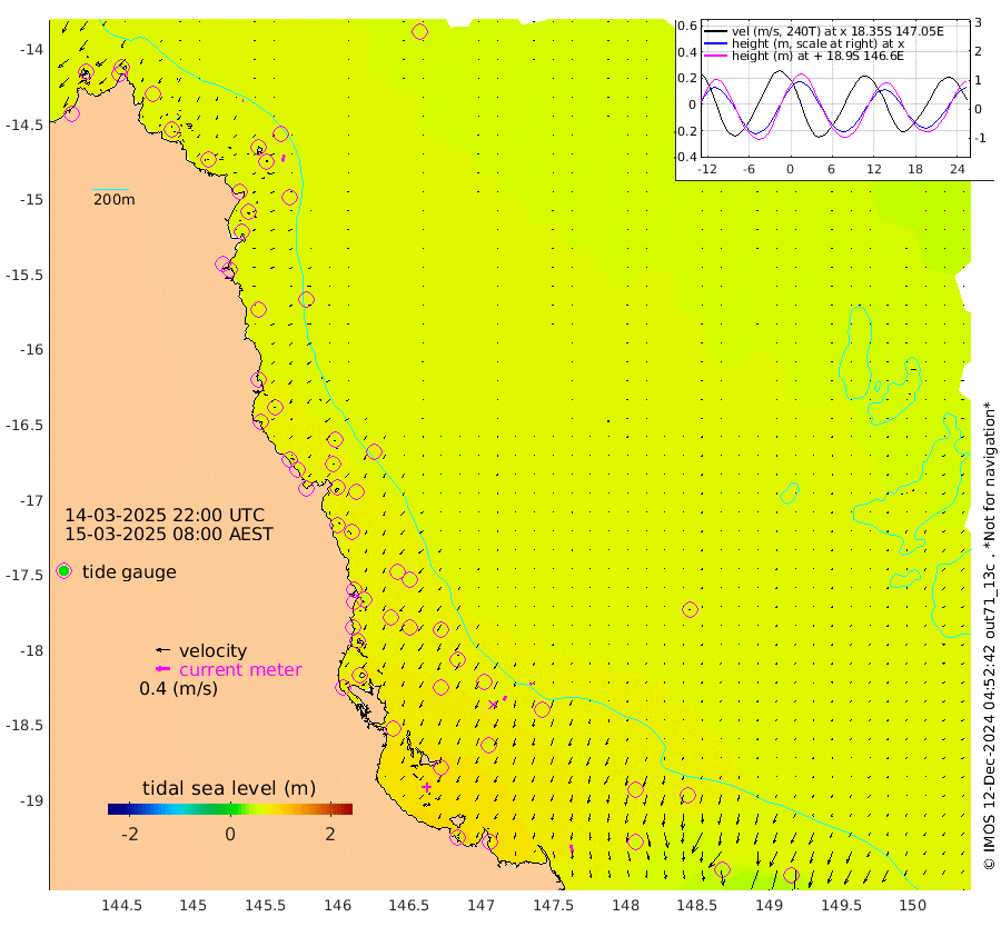 1cm/s -99T +11cm/s rms + 4cm/s -61T. GBRLSL 354m 18cm/s -167T +15cm/s rms + 2cm/s -84T. GBRLSH 32m 14cm/s -158T +15cm/s rms + 5cm/s -155T. GBRPPS 72m 7cm/s -152T +17cm/s rms + 13cm/s 115T. GBRMYR 223m 20cm/s 169T +18cm/s rms + 0cm/s -9T. NRSYON 29m 57cm Osprey Reef - West 66cm Stanley Island 41cm Pipon Islands 60cm Cape Melville 60cm Munro Reef 61cm Leggatt Island 71cm Normanby River 61cm Carter Reef 60cm Lizard Island (QLD) 71cm East Petherbridge Island 65cm North Direction Island 72cm Cape Flattery 62cm Ribbon Reef No.9 70cm Low Wooded Island 64cm Cape Bedford 30cm Endeavour River North 65cm Cooktown 62cm Cruiser Passage 72cm East Hope Island 53cm Bailay Creek 62cm Low Islets 67cm Port Douglas 68cm Palm Cove 61cm Yorkeys Knob 63cm Michaelmas Cay 78cm Euston Reef 68cm Cairns 67cm Green Island 69cm Fitzroy Island 68cm Sudbury Cay 61cm High Island 68cm Russell Island 65cm Peart Reef 59cm Nathan Reef 67cm Mourilyan Harbour 72cm Cowley Beach 52cm North Barnard Island 74cm Eddy Reef 87cm Beaver Reef 67cm Unnamed Reef No. 1 67cm Flinders Reef 72cm Clump Point 68cm Dunk Island 65cm Barnett Patches 74cm Goold Island 77cm Cardwell 74cm Britomart Reef 71cm Pith Reef 69cm Dip Reef 77cm Lucinda (Offshore) 66cm John Brewer Reef 83cm Albino Rock 69cm Shrimp Reef 66cm Jaguar Reef 83cm Townsville 79cm Cape Ferguson 53cm Stanley Reef 46cm Wallaby Reef 56cm Kennedy Reef