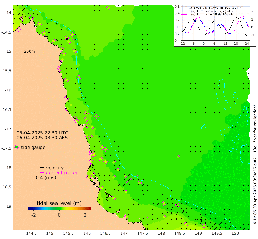 0cm/s -44T +11cm/s rms + 4cm/s -61T. GBRLSL 354m 14cm/s 24T +15cm/s rms + 2cm/s -84T. GBRLSH 32m 17cm/s 50T +15cm/s rms + 5cm/s -155T. GBRPPS 72m 8cm/s 42T +17cm/s rms + 13cm/s 115T. GBRMYR 223m 13cm/s 46T +18cm/s rms + 0cm/s -9T. NRSYON 29m 34cm Osprey Reef - West 55cm Stanley Island 19cm Pipon Islands 44cm Cape Melville 52cm Munro Reef 50cm Leggatt Island 56cm Normanby River 49cm Carter Reef 41cm Lizard Island (QLD) 52cm East Petherbridge Island 45cm North Direction Island 45cm Cape Flattery 40cm Ribbon Reef No.9 39cm Low Wooded Island 42cm Cape Bedford 25cm Endeavour River North 41cm Cooktown 35cm Cruiser Passage 39cm East Hope Island 46cm Bailay Creek 42cm Low Islets 41cm Port Douglas 36cm Palm Cove 38cm Yorkeys Knob 42cm Michaelmas Cay 27cm Euston Reef 42cm Cairns 34cm Green Island 33cm Fitzroy Island 39cm Sudbury Cay 34cm High Island 32cm Russell Island 41cm Peart Reef 37cm Nathan Reef 42cm Mourilyan Harbour 39cm Cowley Beach 53cm North Barnard Island 39cm Eddy Reef 59cm Beaver Reef 36cm Unnamed Reef No. 1 28cm Flinders Reef 41cm Clump Point 44cm Dunk Island 40cm Barnett Patches 42cm Goold Island 56cm Cardwell 33cm Britomart Reef 35cm Pith Reef 33cm Dip Reef 46cm Lucinda (Offshore) 51cm John Brewer Reef 40cm Albino Rock 39cm Shrimp Reef 26cm Jaguar Reef 45cm Townsville 41cm Cape Ferguson 52cm Stanley Reef 52cm Wallaby Reef 32cm Kennedy Reef