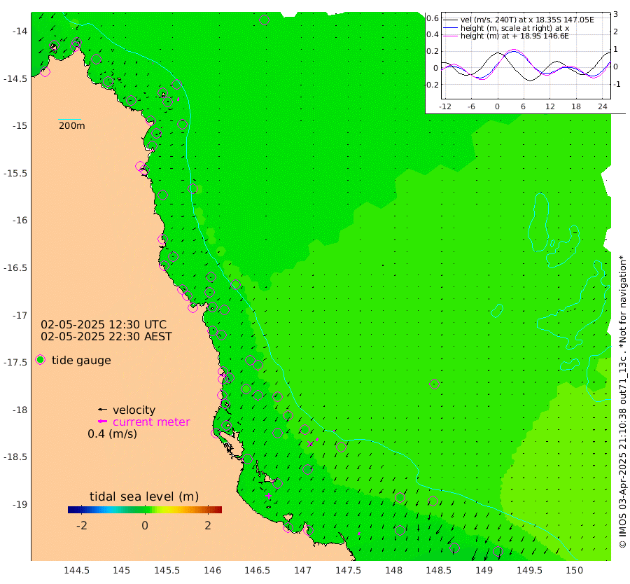 1cm/s -103T +11cm/s rms + 4cm/s -61T. GBRLSL 354m 14cm/s -163T +15cm/s rms + 2cm/s -84T. GBRLSH 32m 12cm/s -135T +15cm/s rms + 5cm/s -155T. GBRPPS 72m 6cm/s -129T +17cm/s rms + 13cm/s 115T. GBRMYR 223m 11cm/s -166T +18cm/s rms + 0cm/s -9T. NRSYON 29m 13cm Osprey Reef - West -4cm Stanley Island -11cm Pipon Islands -3cm Cape Melville 0cm Munro Reef 0cm Leggatt Island -2cm Normanby River -2cm Carter Reef 2cm Lizard Island (QLD) 0cm East Petherbridge Island 1cm North Direction Island 5cm Cape Flattery 12cm Ribbon Reef No.9 12cm Low Wooded Island 2cm Cape Bedford 17cm Endeavour River North 4cm Cooktown 14cm Cruiser Passage 6cm East Hope Island -2cm Bailay Creek 2cm Low Islets 5cm Port Douglas 8cm Palm Cove 6cm Yorkeys Knob 5cm Michaelmas Cay 16cm Euston Reef 5cm Cairns 11cm Green Island 6cm Fitzroy Island 10cm Sudbury Cay 4cm High Island 7cm Russell Island 3cm Peart Reef 4cm Nathan Reef 5cm Mourilyan Harbour 6cm Cowley Beach -8cm North Barnard Island 16cm Eddy Reef 7cm Beaver Reef 12cm Unnamed Reef No. 1 18cm Flinders Reef 6cm Clump Point 2cm Dunk Island 8cm Barnett Patches 5cm Goold Island -3cm Cardwell 6cm Britomart Reef 13cm Pith Reef 20cm Dip Reef 3cm Lucinda (Offshore) -8cm John Brewer Reef 12cm Albino Rock 7cm Shrimp Reef 16cm Jaguar Reef 3cm Townsville 5cm Cape Ferguson -6cm Stanley Reef -3cm Wallaby Reef 6cm Kennedy Reef