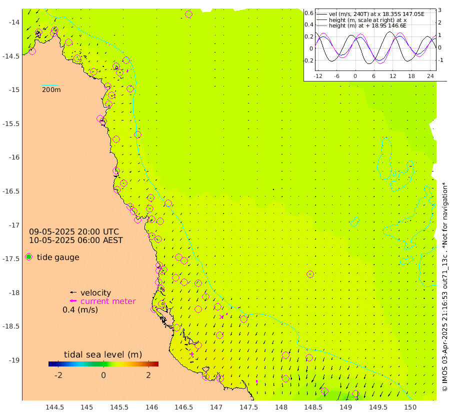 1cm/s -86T +11cm/s rms + 4cm/s -61T. GBRLSL 354m 15cm/s -167T +15cm/s rms + 2cm/s -84T. GBRLSH 32m 12cm/s -156T +15cm/s rms + 5cm/s -155T. GBRPPS 72m 6cm/s -152T +17cm/s rms + 13cm/s 115T. GBRMYR 223m 15cm/s 172T +18cm/s rms + 0cm/s -9T. NRSYON 29m 42cm Osprey Reef - West 49cm Stanley Island 36cm Pipon Islands 48cm Cape Melville 49cm Munro Reef 46cm Leggatt Island 52cm Normanby River 48cm Carter Reef 48cm Lizard Island (QLD) 56cm East Petherbridge Island 52cm North Direction Island 56cm Cape Flattery 49cm Ribbon Reef No.9 59cm Low Wooded Island 51cm Cape Bedford 18cm Endeavour River North 51cm Cooktown 49cm Cruiser Passage 59cm East Hope Island 45cm Bailay Creek 50cm Low Islets 52cm Port Douglas 54cm Palm Cove 48cm Yorkeys Knob 47cm Michaelmas Cay 61cm Euston Reef 54cm Cairns 51cm Green Island 54cm Fitzroy Island 52cm Sudbury Cay 49cm High Island 52cm Russell Island 51cm Peart Reef 47cm Nathan Reef 52cm Mourilyan Harbour 57cm Cowley Beach 38cm North Barnard Island 57cm Eddy Reef 67cm Beaver Reef 51cm Unnamed Reef No. 1 51cm Flinders Reef 56cm Clump Point 52cm Dunk Island 52cm Barnett Patches 57cm Goold Island 59cm Cardwell 60cm Britomart Reef 55cm Pith Reef 52cm Dip Reef 60cm Lucinda (Offshore) 50cm John Brewer Reef 64cm Albino Rock 55cm Shrimp Reef 51cm Jaguar Reef 64cm Townsville 61cm Cape Ferguson 41cm Stanley Reef 35cm Wallaby Reef 45cm Kennedy Reef
