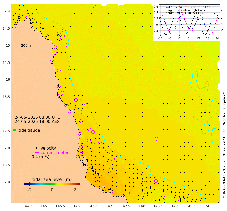 2cm/s 117T +11cm/s rms + 4cm/s -61T. GBRLSL 354m 29cm/s -170T +15cm/s rms + 2cm/s -84T. GBRLSH 32m 18cm/s -157T +15cm/s rms + 5cm/s -155T. GBRPPS 72m 9cm/s -153T +17cm/s rms + 13cm/s 115T. GBRMYR 223m 27cm/s 167T +18cm/s rms + 0cm/s -9T. NRSYON 29m 67cm Osprey Reef - West 73cm Stanley Island 69cm Pipon Islands 66cm Cape Melville 73cm Munro Reef 74cm Leggatt Island 79cm Normanby River 74cm Carter Reef 73cm Lizard Island (QLD) 68cm East Petherbridge Island 66cm North Direction Island 77cm Cape Flattery 72cm Ribbon Reef No.9 72cm Low Wooded Island 64cm Cape Bedford 35cm Endeavour River North 76cm Cooktown 73cm Cruiser Passage 83cm East Hope Island 57cm Bailay Creek 72cm Low Islets 81cm Port Douglas 85cm Palm Cove 83cm Yorkeys Knob 71cm Michaelmas Cay 74cm Euston Reef 83cm Cairns 84cm Green Island 88cm Fitzroy Island 79cm Sudbury Cay 81cm High Island 79cm Russell Island 83cm Peart Reef 81cm Nathan Reef 82cm Mourilyan Harbour 85cm Cowley Beach 70cm North Barnard Island 79cm Eddy Reef 104cm Beaver Reef 83cm Unnamed Reef No. 1 78cm Flinders Reef 89cm Clump Point 92cm Dunk Island 77cm Barnett Patches 97cm Goold Island 94cm Cardwell 98cm Britomart Reef 77cm Pith Reef 80cm Dip Reef 96cm Lucinda (Offshore) 86cm John Brewer Reef 98cm Albino Rock 81cm Shrimp Reef 83cm Jaguar Reef 105cm Townsville 100cm Cape Ferguson 70cm Stanley Reef 62cm Wallaby Reef 76cm Kennedy Reef