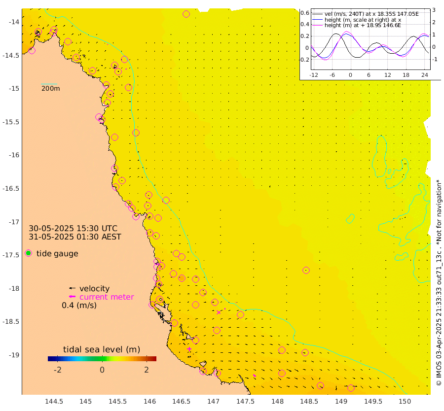 3cm/s -66T +11cm/s rms + 4cm/s -61T. GBRLSL 354m 4cm/s 164T +15cm/s rms + 2cm/s -84T. GBRLSH 32m 7cm/s 98T +15cm/s rms + 5cm/s -155T. GBRPPS 72m 2cm/s 112T +17cm/s rms + 13cm/s 115T. GBRMYR 223m 18cm/s 129T +18cm/s rms + 0cm/s -9T. NRSYON 29m 86cm Osprey Reef - West 94cm Stanley Island 76cm Pipon Islands 91cm Cape Melville 95cm Munro Reef 96cm Leggatt Island 102cm Normanby River 93cm Carter Reef 94cm Lizard Island (QLD) 89cm East Petherbridge Island 87cm North Direction Island 91cm Cape Flattery 91cm Ribbon Reef No.9 102cm Low Wooded Island 82cm Cape Bedford 63cm Endeavour River North 93cm Cooktown 90cm Cruiser Passage 90cm East Hope Island 90cm Bailay Creek 87cm Low Islets 94cm Port Douglas 95cm Palm Cove 98cm Yorkeys Knob 90cm Michaelmas Cay 69cm Euston Reef 97cm Cairns 90cm Green Island 89cm Fitzroy Island 92cm Sudbury Cay 98cm High Island 80cm Russell Island 94cm Peart Reef 93cm Nathan Reef 97cm Mourilyan Harbour 95cm Cowley Beach 106cm North Barnard Island 95cm Eddy Reef 126cm Beaver Reef 96cm Unnamed Reef No. 1 82cm Flinders Reef 101cm Clump Point 106cm Dunk Island 99cm Barnett Patches 110cm Goold Island 115cm Cardwell 101cm Britomart Reef 95cm Pith Reef 97cm Dip Reef 109cm Lucinda (Offshore) 103cm John Brewer Reef 105cm Albino Rock 100cm Shrimp Reef 89cm Jaguar Reef 113cm Townsville 109cm Cape Ferguson 117cm Stanley Reef 112cm Wallaby Reef 105cm Kennedy Reef