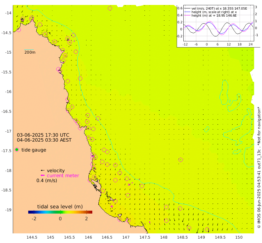 2cm/s -69T +11cm/s rms + 4cm/s -61T. GBRLSL 354m 11cm/s -166T +15cm/s rms + 2cm/s -84T. GBRLSH 32m 9cm/s -163T +15cm/s rms + 5cm/s -155T. GBRPPS 72m 4cm/s -155T +17cm/s rms + 13cm/s 115T. GBRMYR 223m 14cm/s 160T +18cm/s rms + 0cm/s -9T. NRSYON 29m 56cm Osprey Reef - West 56cm Stanley Island 48cm Pipon Islands 57cm Cape Melville 56cm Munro Reef 56cm Leggatt Island 60cm Normanby River 57cm Carter Reef 59cm Lizard Island (QLD) 61cm East Petherbridge Island 60cm North Direction Island 59cm Cape Flattery 60cm Ribbon Reef No.9 76cm Low Wooded Island 58cm Cape Bedford 34cm Endeavour River North 60cm Cooktown 62cm Cruiser Passage 62cm East Hope Island 60cm Bailay Creek 56cm Low Islets 61cm Port Douglas 64cm Palm Cove 62cm Yorkeys Knob 56cm Michaelmas Cay 59cm Euston Reef 63cm Cairns 60cm Green Island 55cm Fitzroy Island 58cm Sudbury Cay 62cm High Island 56cm Russell Island 59cm Peart Reef 57cm Nathan Reef 62cm Mourilyan Harbour 65cm Cowley Beach 53cm North Barnard Island 66cm Eddy Reef 79cm Beaver Reef 63cm Unnamed Reef No. 1 58cm Flinders Reef 65cm Clump Point 65cm Dunk Island 66cm Barnett Patches 70cm Goold Island 69cm Cardwell 71cm Britomart Reef 65cm Pith Reef 66cm Dip Reef 69cm Lucinda (Offshore) 58cm John Brewer Reef 71cm Albino Rock 66cm Shrimp Reef 62cm Jaguar Reef 74cm Townsville 72cm Cape Ferguson 66cm Stanley Reef 59cm Wallaby Reef 64cm Kennedy Reef