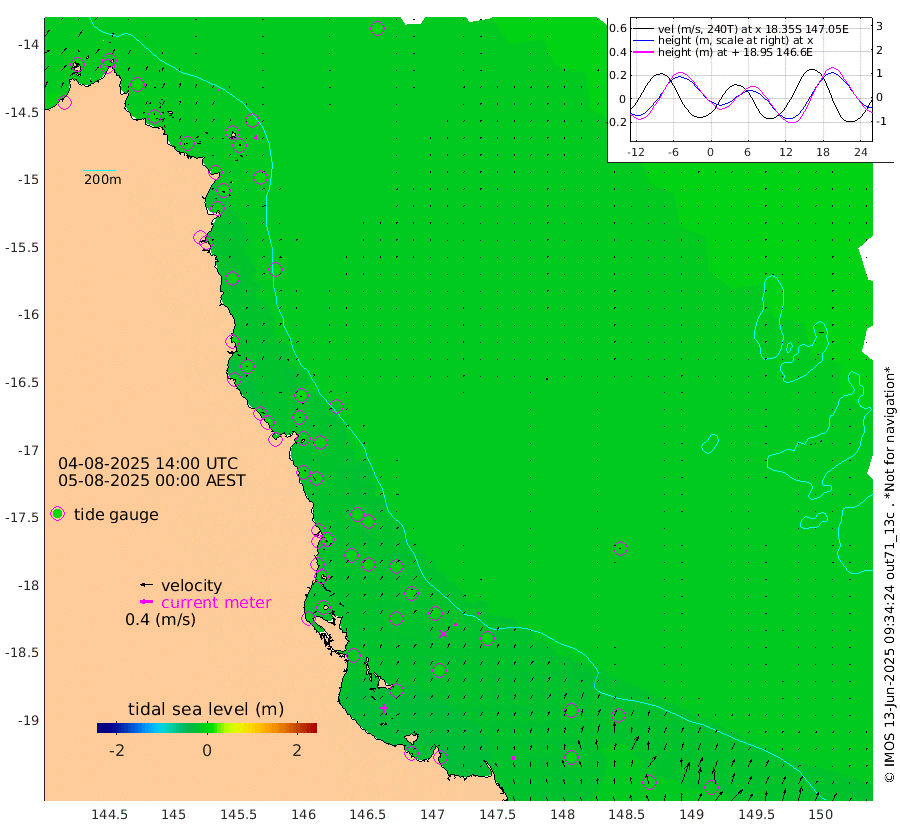 1cm/s -75T +11cm/s rms + 4cm/s -61T. GBRLSL 354m 12cm/s 12T +15cm/s rms + 2cm/s -84T. GBRLSH 32m 11cm/s 35T +15cm/s rms + 5cm/s -155T. GBRPPS 72m 6cm/s 30T +17cm/s rms + 13cm/s 115T. GBRMYR 223m 12cm/s 2T +18cm/s rms + 0cm/s -9T. NRSYON 29m 4cm Osprey Reef - West -1cm Stanley Island -16cm Pipon Islands -1cm Cape Melville 1cm Munro Reef 4cm Leggatt Island -1cm Normanby River 2cm Carter Reef -1cm Lizard Island (QLD) -3cm East Petherbridge Island -4cm North Direction Island -2cm Cape Flattery 5cm Ribbon Reef No.9 8cm Low Wooded Island -3cm Cape Bedford 9cm Endeavour River North -1cm Cooktown 4cm Cruiser Passage -6cm East Hope Island 1cm Bailay Creek 0cm Low Islets -3cm Port Douglas -3cm Palm Cove 1cm Yorkeys Knob 1cm Michaelmas Cay -18cm Euston Reef -3cm Cairns -4cm Green Island -8cm Fitzroy Island -3cm Sudbury Cay -1cm High Island -6cm Russell Island 0cm Peart Reef 0cm Nathan Reef -3cm Mourilyan Harbour -10cm Cowley Beach 4cm North Barnard Island -2cm Eddy Reef -1cm Beaver Reef -3cm Unnamed Reef No. 1 -1cm Flinders Reef -6cm Clump Point -2cm Dunk Island -3cm Barnett Patches -6cm Goold Island -7cm Cardwell -9cm Britomart Reef -7cm Pith Reef 5cm Dip Reef -9cm Lucinda (Offshore) 1cm John Brewer Reef -14cm Albino Rock -7cm Shrimp Reef -12cm Jaguar Reef -13cm Townsville -12cm Cape Ferguson 2cm Stanley Reef 0cm Wallaby Reef -11cm Kennedy Reef