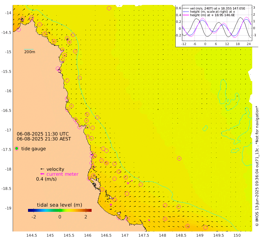 1cm/s -71T +11cm/s rms + 4cm/s -61T. GBRLSL 354m 5cm/s 47T +15cm/s rms + 2cm/s -84T. GBRLSH 32m 12cm/s 73T +15cm/s rms + 5cm/s -155T. GBRPPS 72m 4cm/s 66T +17cm/s rms + 13cm/s 115T. GBRMYR 223m 18cm/s 116T +18cm/s rms + 0cm/s -9T. NRSYON 29m 86cm Osprey Reef - West 104cm Stanley Island 63cm Pipon Islands 92cm Cape Melville 96cm Munro Reef 98cm Leggatt Island 110cm Normanby River 94cm Carter Reef 89cm Lizard Island (QLD) 107cm East Petherbridge Island 98cm North Direction Island 96cm Cape Flattery 90cm Ribbon Reef No.9 98cm Low Wooded Island 94cm Cape Bedford 59cm Endeavour River North 92cm Cooktown 87cm Cruiser Passage 87cm East Hope Island 95cm Bailay Creek 85cm Low Islets 93cm Port Douglas 91cm Palm Cove 87cm Yorkeys Knob 93cm Michaelmas Cay 87cm Euston Reef 96cm Cairns 86cm Green Island 73cm Fitzroy Island 90cm Sudbury Cay 84cm High Island 78cm Russell Island 87cm Peart Reef 81cm Nathan Reef 96cm Mourilyan Harbour 98cm Cowley Beach 95cm North Barnard Island 102cm Eddy Reef 124cm Beaver Reef 93cm Unnamed Reef No. 1 78cm Flinders Reef 100cm Clump Point 100cm Dunk Island 94cm Barnett Patches 105cm Goold Island 120cm Cardwell 92cm Britomart Reef 93cm Pith Reef 91cm Dip Reef 110cm Lucinda (Offshore) 95cm John Brewer Reef 109cm Albino Rock 96cm Shrimp Reef 88cm Jaguar Reef 114cm Townsville 109cm Cape Ferguson 115cm Stanley Reef 113cm Wallaby Reef 104cm Kennedy Reef
