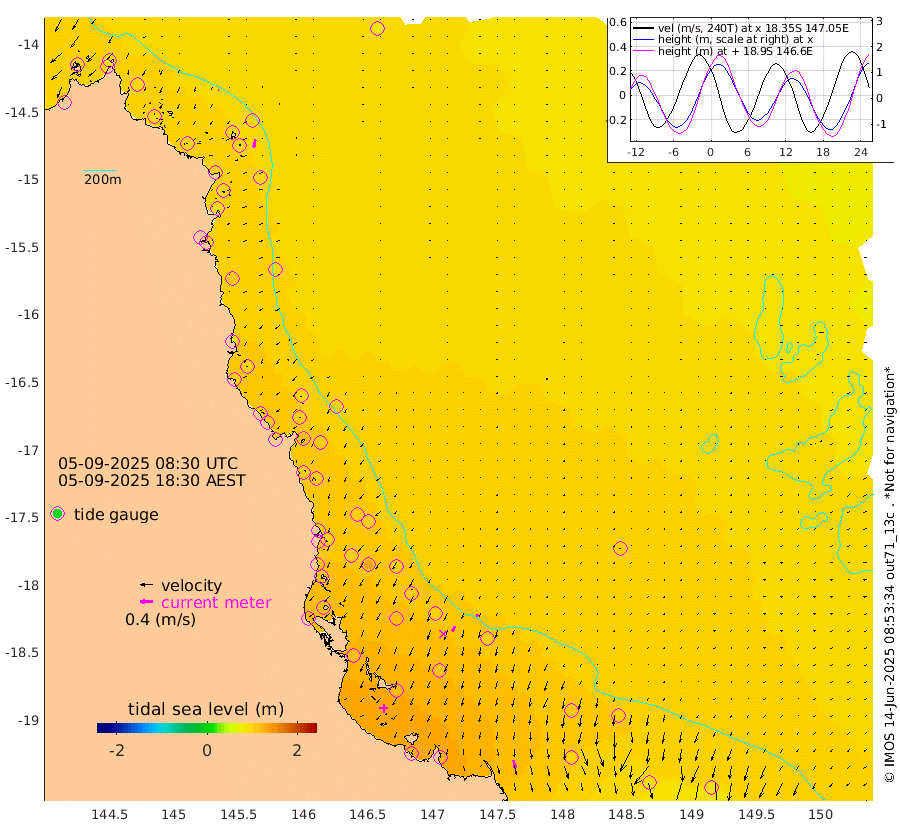 1cm/s -87T +11cm/s rms + 4cm/s -61T. GBRLSL 354m 26cm/s -169T +15cm/s rms + 2cm/s -84T. GBRLSH 32m 18cm/s -160T +15cm/s rms + 5cm/s -155T. GBRPPS 72m 9cm/s -155T +17cm/s rms + 13cm/s 115T. GBRMYR 223m 25cm/s 167T +18cm/s rms + 0cm/s -9T. NRSYON 29m 82cm Osprey Reef - West 98cm Stanley Island 72cm Pipon Islands 90cm Cape Melville 94cm Munro Reef 93cm Leggatt Island 102cm Normanby River 96cm Carter Reef 96cm Lizard Island (QLD) 94cm East Petherbridge Island 91cm North Direction Island 102cm Cape Flattery 90cm Ribbon Reef No.9 97cm Low Wooded Island 87cm Cape Bedford 46cm Endeavour River North 98cm Cooktown 91cm Cruiser Passage 111cm East Hope Island 80cm Bailay Creek 94cm Low Islets 101cm Port Douglas 103cm Palm Cove 100cm Yorkeys Knob 93cm Michaelmas Cay 100cm Euston Reef 103cm Cairns 104cm Green Island 113cm Fitzroy Island 103cm Sudbury Cay 102cm High Island 102cm Russell Island 104cm Peart Reef 98cm Nathan Reef 101cm Mourilyan Harbour 107cm Cowley Beach 95cm North Barnard Island 98cm Eddy Reef 132cm Beaver Reef 101cm Unnamed Reef No. 1 99cm Flinders Reef 108cm Clump Point 110cm Dunk Island 102cm Barnett Patches 115cm Goold Island 115cm Cardwell 117cm Britomart Reef 104cm Pith Reef 100cm Dip Reef 116cm Lucinda (Offshore) 111cm John Brewer Reef 119cm Albino Rock 109cm Shrimp Reef 101cm Jaguar Reef 125cm Townsville 120cm Cape Ferguson 93cm Stanley Reef 83cm Wallaby Reef 90cm Kennedy Reef