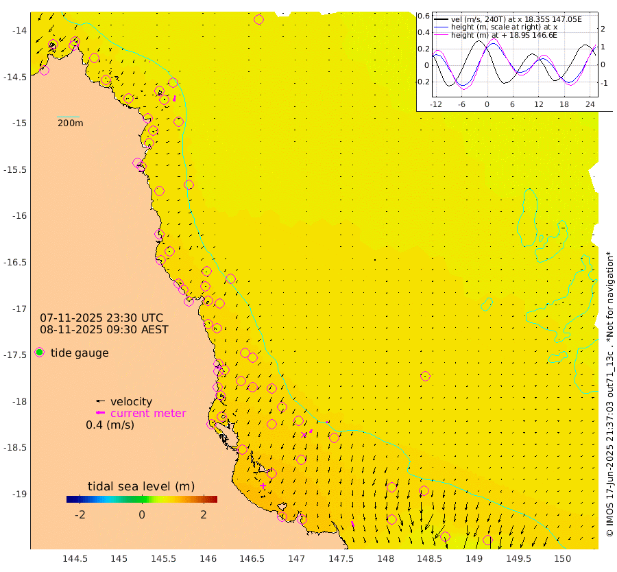 1cm/s -113T +11cm/s rms + 4cm/s -61T. GBRLSL 354m 26cm/s -170T +15cm/s rms + 2cm/s -84T. GBRLSH 32m 16cm/s -157T +15cm/s rms + 5cm/s -155T. GBRPPS 72m 8cm/s -145T +17cm/s rms + 13cm/s 115T. GBRMYR 223m 26cm/s 163T +18cm/s rms + 0cm/s -9T. NRSYON 29m 76cm Osprey Reef - West 71cm Stanley Island 58cm Pipon Islands 65cm Cape Melville 75cm Munro Reef 76cm Leggatt Island 82cm Normanby River 70cm Carter Reef 73cm Lizard Island (QLD) 68cm East Petherbridge Island 66cm North Direction Island 78cm Cape Flattery 80cm Ribbon Reef No.9 81cm Low Wooded Island 63cm Cape Bedford 54cm Endeavour River North 76cm Cooktown 80cm Cruiser Passage 77cm East Hope Island 59cm Bailay Creek 71cm Low Islets 80cm Port Douglas 85cm Palm Cove 84cm Yorkeys Knob 73cm Michaelmas Cay 70cm Euston Reef 82cm Cairns 84cm Green Island 83cm Fitzroy Island 82cm Sudbury Cay 78cm High Island 74cm Russell Island 81cm Peart Reef 80cm Nathan Reef 82cm Mourilyan Harbour 83cm Cowley Beach 69cm North Barnard Island 88cm Eddy Reef 106cm Beaver Reef 86cm Unnamed Reef No. 1 82cm Flinders Reef 87cm Clump Point 88cm Dunk Island 80cm Barnett Patches 93cm Goold Island 91cm Cardwell 90cm Britomart Reef 82cm Pith Reef 91cm Dip Reef 93cm Lucinda (Offshore) 77cm John Brewer Reef 100cm Albino Rock 79cm Shrimp Reef 83cm Jaguar Reef 99cm Townsville 95cm Cape Ferguson 72cm Stanley Reef 69cm Wallaby Reef 80cm Kennedy Reef