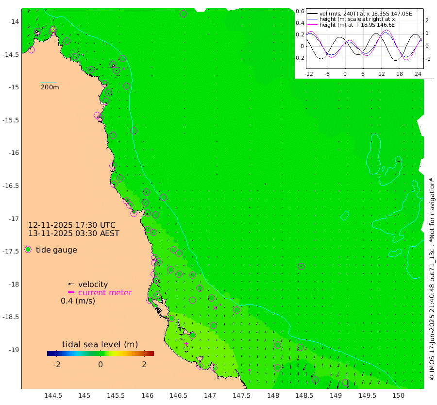 2cm/s 107T +11cm/s rms + 4cm/s -61T. GBRLSL 354m 11cm/s -162T +15cm/s rms + 2cm/s -84T. GBRLSH 32m 8cm/s -149T +15cm/s rms + 5cm/s -155T. GBRPPS 72m 5cm/s -159T +17cm/s rms + 13cm/s 115T. GBRMYR 223m 11cm/s 177T +18cm/s rms + 0cm/s -9T. NRSYON 29m 4cm Osprey Reef - West 2cm Stanley Island 31cm Pipon Islands 5cm Cape Melville -1cm Munro Reef 4cm Leggatt Island 5cm Normanby River 0cm Carter Reef 4cm Lizard Island (QLD) -2cm East Petherbridge Island 1cm North Direction Island 2cm Cape Flattery -1cm Ribbon Reef No.9 -4cm Low Wooded Island 1cm Cape Bedford -4cm Endeavour River North 5cm Cooktown 0cm Cruiser Passage 3cm East Hope Island -6cm Bailay Creek 3cm Low Islets 8cm Port Douglas 10cm Palm Cove 10cm Yorkeys Knob 3cm Michaelmas Cay 4cm Euston Reef 9cm Cairns 7cm Green Island 12cm Fitzroy Island 4cm Sudbury Cay 12cm High Island 8cm Russell Island 8cm Peart Reef 10cm Nathan Reef 8cm Mourilyan Harbour 10cm Cowley Beach 4cm North Barnard Island 4cm Eddy Reef 4cm Beaver Reef 8cm Unnamed Reef No. 1 3cm Flinders Reef 11cm Clump Point 12cm Dunk Island 2cm Barnett Patches 15cm Goold Island 13cm Cardwell 17cm Britomart Reef 5cm Pith Reef 3cm Dip Reef 14cm Lucinda (Offshore) 9cm John Brewer Reef 12cm Albino Rock 4cm Shrimp Reef 10cm Jaguar Reef 19cm Townsville 18cm Cape Ferguson 4cm Stanley Reef 0cm Wallaby Reef 18cm Kennedy Reef