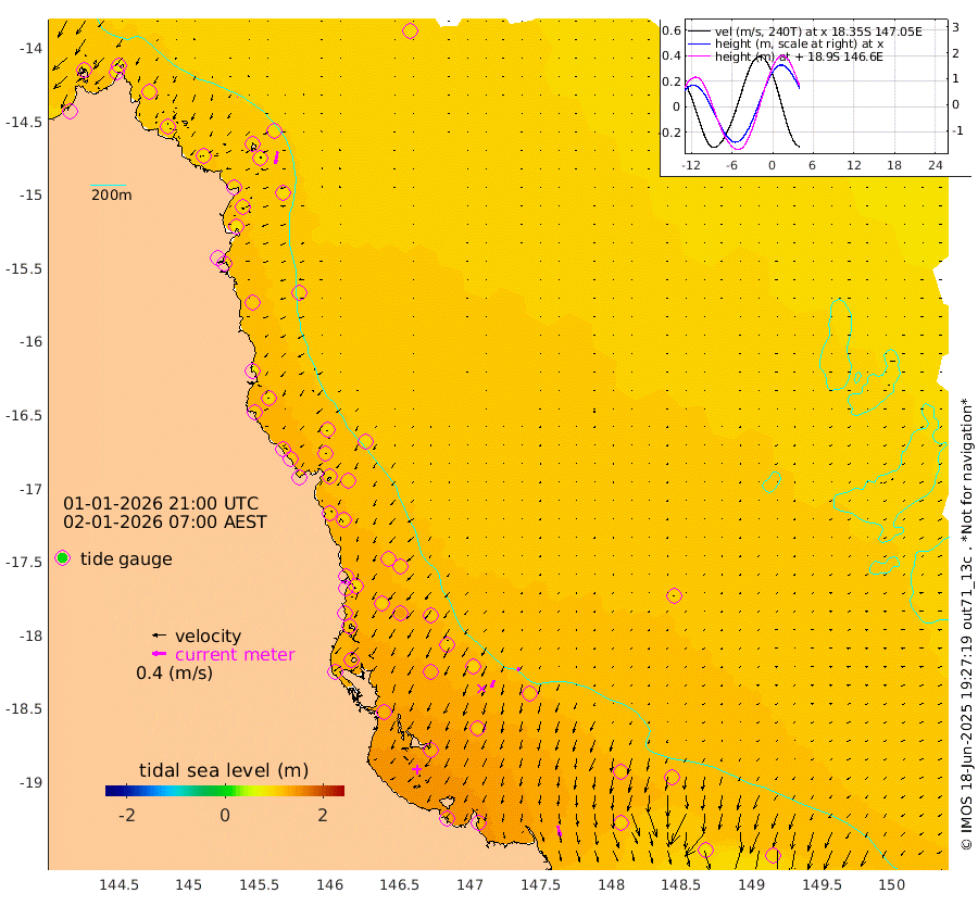 0cm/s -122T +11cm/s rms + 4cm/s -61T. GBRLSL 354m 35cm/s -170T +15cm/s rms + 2cm/s -84T. GBRLSH 32m 21cm/s -157T +15cm/s rms + 5cm/s -155T. GBRPPS 72m 11cm/s -150T +17cm/s rms + 13cm/s 115T. GBRMYR 223m 31cm/s 167T +18cm/s rms + 0cm/s -9T. NRSYON 29m 93cm Osprey Reef - West 95cm Stanley Island 78cm Pipon Islands 86cm Cape Melville 94cm Munro Reef 96cm Leggatt Island 103cm Normanby River 94cm Carter Reef 98cm Lizard Island (QLD) 90cm East Petherbridge Island 89cm North Direction Island 100cm Cape Flattery 97cm Ribbon Reef No.9 100cm Low Wooded Island 86cm Cape Bedford 60cm Endeavour River North 100cm Cooktown 99cm Cruiser Passage 106cm East Hope Island 78cm Bailay Creek 94cm Low Islets 105cm Port Douglas 111cm Palm Cove 110cm Yorkeys Knob 94cm Michaelmas Cay 94cm Euston Reef 107cm Cairns 110cm Green Island 109cm Fitzroy Island 105cm Sudbury Cay 106cm High Island 102cm Russell Island 109cm Peart Reef 106cm Nathan Reef 106cm Mourilyan Harbour 110cm Cowley Beach 92cm North Barnard Island 105cm Eddy Reef 136cm Beaver Reef 111cm Unnamed Reef No. 1 105cm Flinders Reef 114cm Clump Point 117cm Dunk Island 107cm Barnett Patches 124cm Goold Island 118cm Cardwell 124cm Britomart Reef 104cm Pith Reef 111cm Dip Reef 122cm Lucinda (Offshore) 109cm John Brewer Reef 126cm Albino Rock 108cm Shrimp Reef 109cm Jaguar Reef 131cm Townsville 127cm Cape Ferguson 98cm Stanley Reef 87cm Wallaby Reef 102cm Kennedy Reef