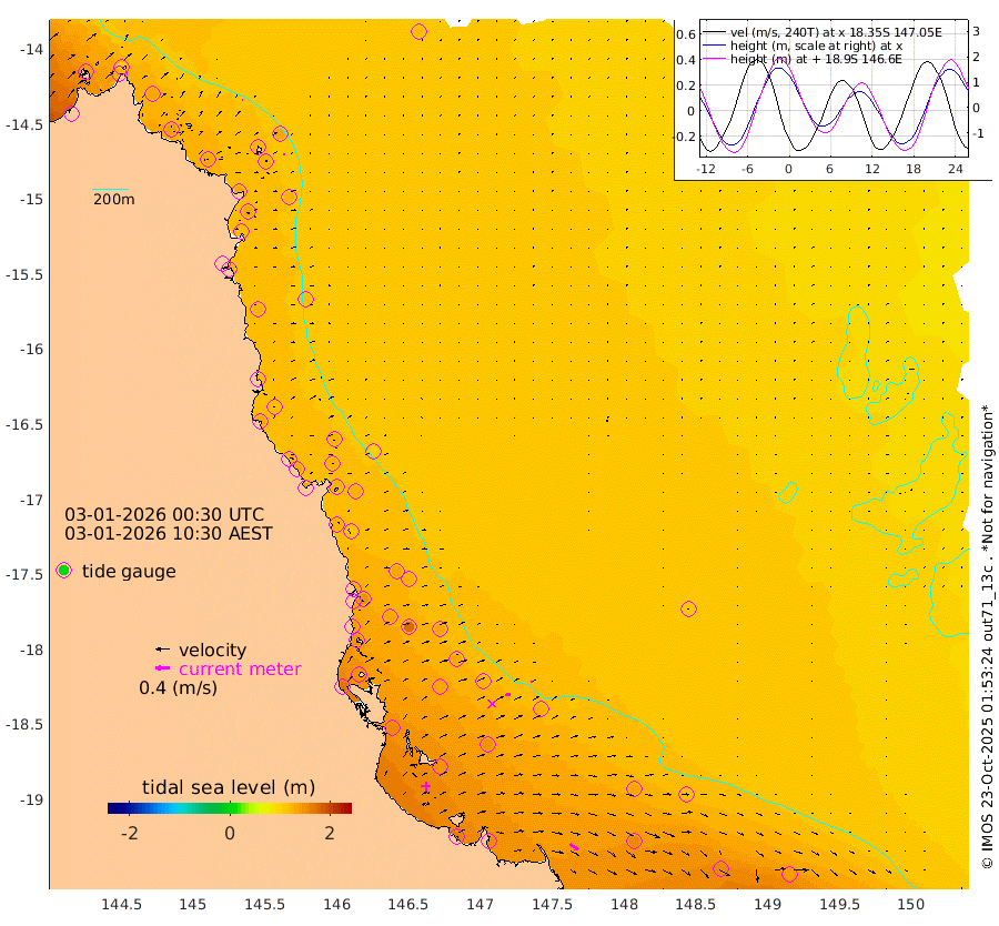 2cm/s -74T +11cm/s rms + 4cm/s -61T. GBRLSL 354m 5cm/s 72T +15cm/s rms + 2cm/s -84T. GBRLSH 32m 15cm/s 78T +15cm/s rms + 5cm/s -155T. GBRPPS 72m 4cm/s 76T +17cm/s rms + 13cm/s 115T. GBRMYR 223m 28cm/s 123T +18cm/s rms + 0cm/s -9T. NRSYON 29m 114cm Osprey Reef - West 138cm Stanley Island 99cm Pipon Islands 125cm Cape Melville 134cm Munro Reef 136cm Leggatt Island 150cm Normanby River 130cm Carter Reef 126cm Lizard Island (QLD) 129cm East Petherbridge Island 121cm North Direction Island 131cm Cape Flattery 122cm Ribbon Reef No.9 128cm Low Wooded Island 115cm Cape Bedford 80cm Endeavour River North 127cm Cooktown 118cm Cruiser Passage 124cm East Hope Island 120cm Bailay Creek 120cm Low Islets 129cm Port Douglas 127cm Palm Cove 128cm Yorkeys Knob 125cm Michaelmas Cay 100cm Euston Reef 133cm Cairns 121cm Green Island 123cm Fitzroy Island 127cm Sudbury Cay 124cm High Island 108cm Russell Island 128cm Peart Reef 122cm Nathan Reef 134cm Mourilyan Harbour 132cm Cowley Beach 146cm North Barnard Island 132cm Eddy Reef 174cm Beaver Reef 128cm Unnamed Reef No. 1 110cm Flinders Reef 139cm Clump Point 145cm Dunk Island 130cm Barnett Patches 149cm Goold Island 166cm Cardwell 132cm Britomart Reef 125cm Pith Reef 126cm Dip Reef 153cm Lucinda (Offshore) 145cm John Brewer Reef 149cm Albino Rock 134cm Shrimp Reef 119cm Jaguar Reef 159cm Townsville 151cm Cape Ferguson 155cm Stanley Reef 153cm Wallaby Reef 140cm Kennedy Reef