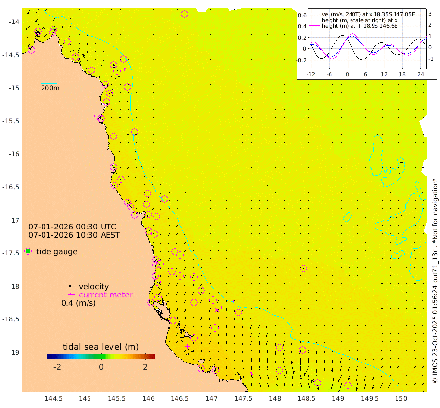 2cm/s -89T +11cm/s rms + 4cm/s -61T. GBRLSL 354m 17cm/s -166T +15cm/s rms + 2cm/s -84T. GBRLSH 32m 14cm/s -156T +15cm/s rms + 5cm/s -155T. GBRPPS 72m 7cm/s -147T +17cm/s rms + 13cm/s 115T. GBRMYR 223m 22cm/s 165T +18cm/s rms + 0cm/s -9T. NRSYON 29m 70cm Osprey Reef - West 66cm Stanley Island 45cm Pipon Islands 62cm Cape Melville 63cm Munro Reef 67cm Leggatt Island 75cm Normanby River 62cm Carter Reef 65cm Lizard Island (QLD) 70cm East Petherbridge Island 66cm North Direction Island 73cm Cape Flattery 72cm Ribbon Reef No.9 83cm Low Wooded Island 64cm Cape Bedford 50cm Endeavour River North 69cm Cooktown 73cm Cruiser Passage 70cm East Hope Island 59cm Bailay Creek 64cm Low Islets 71cm Port Douglas 75cm Palm Cove 71cm Yorkeys Knob 69cm Michaelmas Cay 74cm Euston Reef 73cm Cairns 74cm Green Island 68cm Fitzroy Island 73cm Sudbury Cay 70cm High Island 69cm Russell Island 70cm Peart Reef 66cm Nathan Reef 73cm Mourilyan Harbour 75cm Cowley Beach 59cm North Barnard Island 83cm Eddy Reef 94cm Beaver Reef 77cm Unnamed Reef No. 1 74cm Flinders Reef 77cm Clump Point 76cm Dunk Island 74cm Barnett Patches 82cm Goold Island 80cm Cardwell 79cm Britomart Reef 78cm Pith Reef 84cm Dip Reef 82cm Lucinda (Offshore) 65cm John Brewer Reef 89cm Albino Rock 74cm Shrimp Reef 75cm Jaguar Reef 87cm Townsville 84cm Cape Ferguson 67cm Stanley Reef 60cm Wallaby Reef 70cm Kennedy Reef