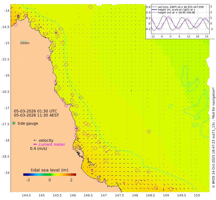 2cm/s -73T +11cm/s rms + 4cm/s -61T. GBRLSL 354m 6cm/s 24T +15cm/s rms + 2cm/s -84T. GBRLSH 32m 13cm/s 62T +15cm/s rms + 5cm/s -155T. GBRPPS 72m 3cm/s 63T +17cm/s rms + 13cm/s 115T. GBRMYR 223m 21cm/s 120T +18cm/s rms + 0cm/s -9T. NRSYON 29m 60cm Osprey Reef - West 70cm Stanley Island 66cm Pipon Islands 64cm Cape Melville 68cm Munro Reef 73cm Leggatt Island 88cm Normanby River 63cm Carter Reef 62cm Lizard Island (QLD) 69cm East Petherbridge Island 62cm North Direction Island 66cm Cape Flattery 64cm Ribbon Reef No.9 74cm Low Wooded Island 57cm Cape Bedford 45cm Endeavour River North 64cm Cooktown 61cm Cruiser Passage 53cm East Hope Island 68cm Bailay Creek 59cm Low Islets 66cm Port Douglas 65cm Palm Cove 65cm Yorkeys Knob 60cm Michaelmas Cay 39cm Euston Reef 69cm Cairns 55cm Green Island 53cm Fitzroy Island 60cm Sudbury Cay 57cm High Island 43cm Russell Island 61cm Peart Reef 59cm Nathan Reef 69cm Mourilyan Harbour 67cm Cowley Beach 74cm North Barnard Island 76cm Eddy Reef 92cm Beaver Reef 65cm Unnamed Reef No. 1 50cm Flinders Reef 72cm Clump Point 76cm Dunk Island 66cm Barnett Patches 78cm Goold Island 93cm Cardwell 66cm Britomart Reef 61cm Pith Reef 66cm Dip Reef 82cm Lucinda (Offshore) 68cm John Brewer Reef 81cm Albino Rock 64cm Shrimp Reef 57cm Jaguar Reef 86cm Townsville 80cm Cape Ferguson 87cm Stanley Reef 86cm Wallaby Reef 77cm Kennedy Reef