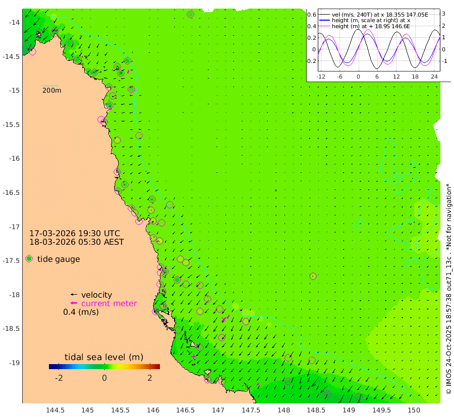 1cm/s -96T +11cm/s rms + 4cm/s -61T. GBRLSL 354m 21cm/s -159T +15cm/s rms + 2cm/s -84T. GBRLSH 32m 24cm/s -142T +15cm/s rms + 5cm/s -155T. GBRPPS 72m 11cm/s -146T +17cm/s rms + 13cm/s 115T. GBRMYR 223m 17cm/s -145T +18cm/s rms + 0cm/s -9T. NRSYON 29m 18cm Osprey Reef - West 11cm Stanley Island 5cm Pipon Islands 12cm Cape Melville 9cm Munro Reef 10cm Leggatt Island 9cm Normanby River 14cm Carter Reef 20cm Lizard Island (QLD) 8cm East Petherbridge Island 13cm North Direction Island 19cm Cape Flattery 19cm Ribbon Reef No.9 24cm Low Wooded Island 13cm Cape Bedford 9cm Endeavour River North 21cm Cooktown 24cm Cruiser Passage 31cm East Hope Island 2cm Bailay Creek 21cm Low Islets 21cm Port Douglas 27cm Palm Cove 29cm Yorkeys Knob 18cm Michaelmas Cay 26cm Euston Reef 21cm Cairns 34cm Green Island 37cm Fitzroy Island 27cm Sudbury Cay 32cm High Island 40cm Russell Island 33cm Peart Reef 30cm Nathan Reef 19cm Mourilyan Harbour 23cm Cowley Beach 9cm North Barnard Island 13cm Eddy Reef 25cm Beaver Reef 26cm Unnamed Reef No. 1 36cm Flinders Reef 22cm Clump Point 24cm Dunk Island 25cm Barnett Patches 25cm Goold Island 7cm Cardwell 37cm Britomart Reef 25cm Pith Reef 31cm Dip Reef 19cm Lucinda (Offshore) 26cm John Brewer Reef 22cm Albino Rock 23cm Shrimp Reef 24cm Jaguar Reef 23cm Townsville 24cm Cape Ferguson -2cm Stanley Reef -16cm Wallaby Reef -2cm Kennedy Reef