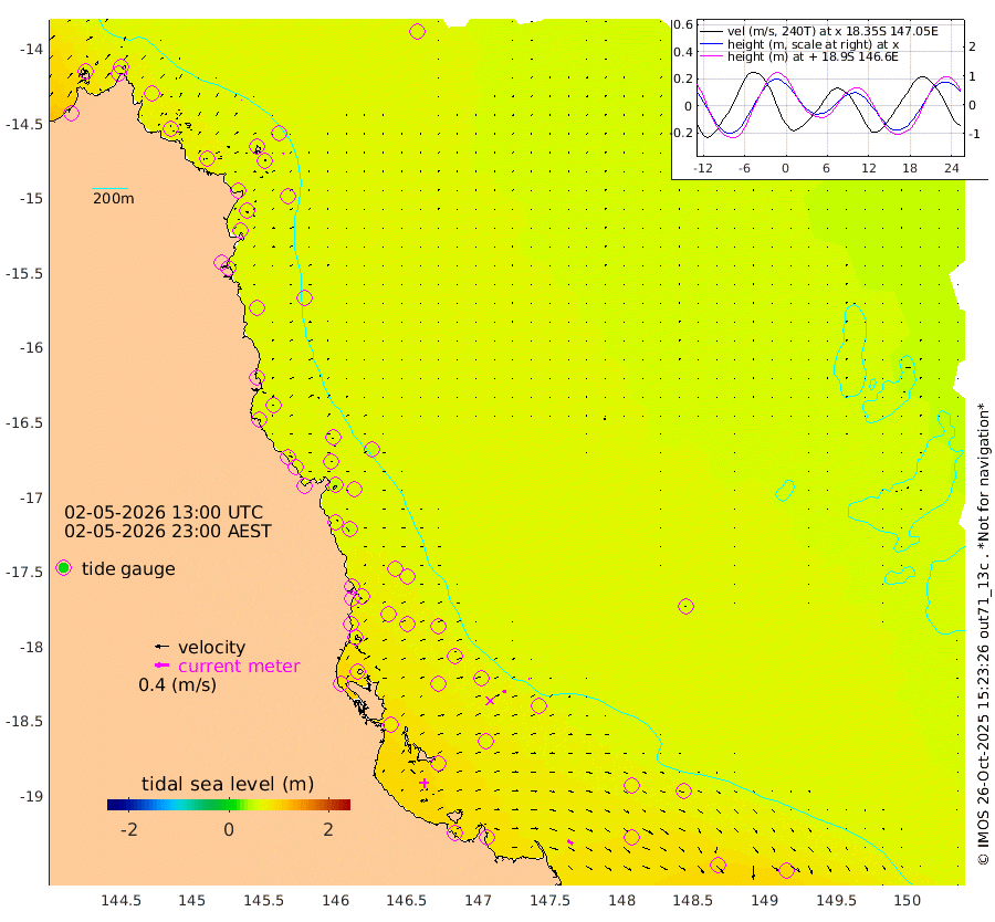 0cm/s -72T +11cm/s rms + 4cm/s -61T. GBRLSL 354m 4cm/s 50T +15cm/s rms + 2cm/s -84T. GBRLSH 32m 9cm/s 72T +15cm/s rms + 5cm/s -155T. GBRPPS 72m 2cm/s 81T +17cm/s rms + 13cm/s 115T. GBRMYR 223m 18cm/s 124T +18cm/s rms + 0cm/s -9T. NRSYON 29m 67cm Osprey Reef - West 67cm Stanley Island 53cm Pipon Islands 62cm Cape Melville 67cm Munro Reef 71cm Leggatt Island 76cm Normanby River 60cm Carter Reef 64cm Lizard Island (QLD) 67cm East Petherbridge Island 63cm North Direction Island 65cm Cape Flattery 67cm Ribbon Reef No.9 71cm Low Wooded Island 61cm Cape Bedford 56cm Endeavour River North 65cm Cooktown 66cm Cruiser Passage 56cm East Hope Island 64cm Bailay Creek 59cm Low Islets 67cm Port Douglas 68cm Palm Cove 66cm Yorkeys Knob 65cm Michaelmas Cay 52cm Euston Reef 70cm Cairns 61cm Green Island 51cm Fitzroy Island 64cm Sudbury Cay 63cm High Island 50cm Russell Island 62cm Peart Reef 61cm Nathan Reef 71cm Mourilyan Harbour 69cm Cowley Beach 70cm North Barnard Island 78cm Eddy Reef 90cm Beaver Reef 71cm Unnamed Reef No. 1 57cm Flinders Reef 74cm Clump Point 75cm Dunk Island 68cm Barnett Patches 80cm Goold Island 88cm Cardwell 67cm Britomart Reef 67cm Pith Reef 71cm Dip Reef 81cm Lucinda (Offshore) 63cm John Brewer Reef 84cm Albino Rock 68cm Shrimp Reef 68cm Jaguar Reef 85cm Townsville 81cm Cape Ferguson 88cm Stanley Reef 90cm Wallaby Reef 92cm Kennedy Reef
