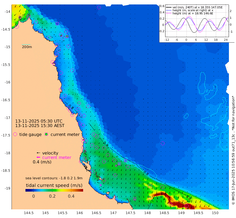 2cm/s -70T +11cm/s rms + 4cm/s -61T. GBRLSL 354m 18cm/s -166T +15cm/s rms + 2cm/s -84T. GBRLSH 32m 13cm/s -159T +15cm/s rms + 5cm/s -155T. GBRPPS 72m 7cm/s -153T +17cm/s rms + 13cm/s 115T. GBRMYR 223m 18cm/s 166T +18cm/s rms + 0cm/s -9T. NRSYON 29m 69cm Osprey Reef - West 69cm Stanley Island 60cm Pipon Islands 68cm Cape Melville 68cm Munro Reef 69cm Leggatt Island 75cm Normanby River 69cm Carter Reef 73cm Lizard Island (QLD) 71cm East Petherbridge Island 71cm North Direction Island 71cm Cape Flattery 73cm Ribbon Reef No.9 90cm Low Wooded Island 68cm Cape Bedford 46cm Endeavour River North 74cm Cooktown 76cm Cruiser Passage 76cm East Hope Island 70cm Bailay Creek 69cm Low Islets 76cm Port Douglas 80cm Palm Cove 80cm Yorkeys Knob 70cm Michaelmas Cay 69cm Euston Reef 78cm Cairns 78cm Green Island 72cm Fitzroy Island 74cm Sudbury Cay 81cm High Island 73cm Russell Island 77cm Peart Reef 75cm Nathan Reef 77cm Mourilyan Harbour 80cm Cowley Beach 69cm North Barnard Island 78cm Eddy Reef 99cm Beaver Reef 80cm Unnamed Reef No. 1 73cm Flinders Reef 81cm Clump Point 83cm Dunk Island 82cm Barnett Patches 88cm Goold Island 84cm Cardwell 89cm Britomart Reef 80cm Pith Reef 82cm Dip Reef 86cm Lucinda (Offshore) 75cm John Brewer Reef 87cm Albino Rock 81cm Shrimp Reef 77cm Jaguar Reef 92cm Townsville 90cm Cape Ferguson 80cm Stanley Reef 69cm Wallaby Reef 75cm Kennedy Reef