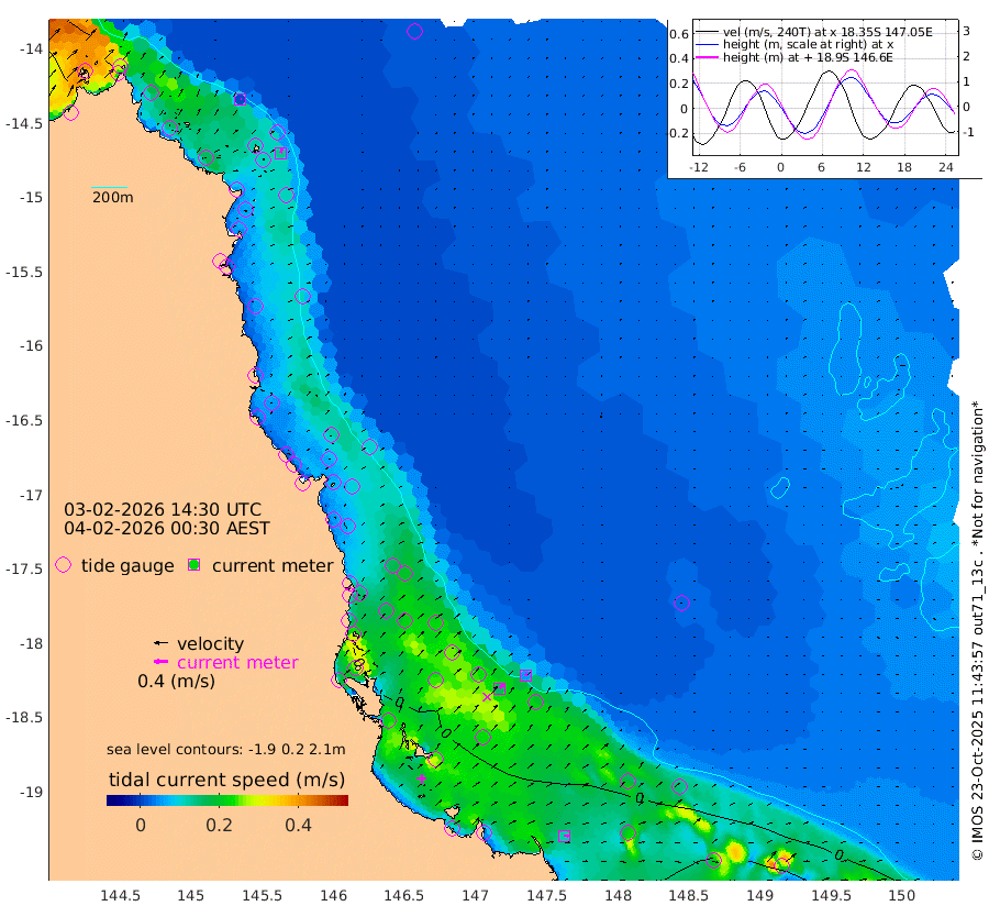 1cm/s 95T +11cm/s rms + 4cm/s -61T. GBRLSL 354m 13cm/s 20T +15cm/s rms + 2cm/s -84T. GBRLSH 32m 16cm/s 44T +15cm/s rms + 5cm/s -155T. GBRPPS 72m 6cm/s 50T +17cm/s rms + 13cm/s 115T. GBRMYR 223m 12cm/s 89T +18cm/s rms + 0cm/s -9T. NRSYON 29m -6cm Osprey Reef - West 2cm Stanley Island 28cm Pipon Islands 4cm Cape Melville 2cm Munro Reef 6cm Leggatt Island 13cm Normanby River -4cm Carter Reef -4cm Lizard Island (QLD) -6cm East Petherbridge Island -9cm North Direction Island -4cm Cape Flattery -8cm Ribbon Reef No.9 -16cm Low Wooded Island -9cm Cape Bedford -3cm Endeavour River North -5cm Cooktown -12cm Cruiser Passage -18cm East Hope Island -4cm Bailay Creek -7cm Low Islets -3cm Port Douglas -7cm Palm Cove -4cm Yorkeys Knob -3cm Michaelmas Cay -25cm Euston Reef -2cm Cairns -14cm Green Island -3cm Fitzroy Island -7cm Sudbury Cay -6cm High Island -18cm Russell Island -7cm Peart Reef -5cm Nathan Reef -1cm Mourilyan Harbour -5cm Cowley Beach 17cm North Barnard Island -3cm Eddy Reef -3cm Beaver Reef -7cm Unnamed Reef No. 1 -16cm Flinders Reef 0cm Clump Point 5cm Dunk Island -11cm Barnett Patches 2cm Goold Island 17cm Cardwell -8cm Britomart Reef -11cm Pith Reef -12cm Dip Reef 7cm Lucinda (Offshore) 5cm John Brewer Reef 0cm Albino Rock -9cm Shrimp Reef -9cm Jaguar Reef 7cm Townsville 4cm Cape Ferguson 14cm Stanley Reef 22cm Wallaby Reef 17cm Kennedy Reef