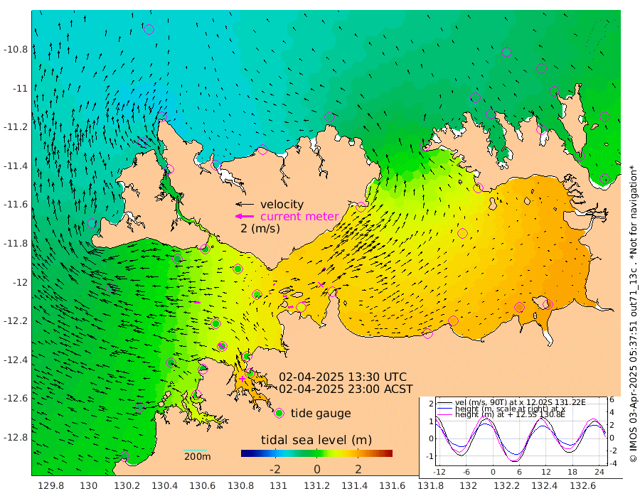 54cm/s 80T +4cm/s rms + 6cm/s 51T. Darwin_C1 52m 41cm/s 89T +4cm/s rms + 7cm/s -161T. Darwin_CW1 22m 14cm/s 57T +4cm/s rms + 8cm/s 61T. Darwin_CW2 34m 56cm/s 43T +3cm/s rms + 9cm/s 98T. Darwin_CW3 22m 41cm/s 93T +5cm/s rms + 7cm/s 88T. Darwin_C3 56m 24cm/s 63T +2cm/s rms + 9cm/s -126T. Darwin_CTbW 22m 71cm/s -84T +1cm/s rms + 1cm/s -47T. DARBGF 30m 86cm/s -54T +4cm/s rms + 3cm/s 80T. NRSDAR 19m -125cm Goodrich Bank -45cm Point Jenny -47cm Native Point -33cm Fish Reef -24cm Tapa Bay -120cm Point Fawcett (Offshore) -2cm Burge Point -38cm Munkunuwa -70cm Beagle A 18cm Parsons Bank -7cm Fenton Patches 33cm Hancox Shoal Area 13cm Nightcliff 32cm Darwin -12cm Charles Point Patches 83cm Glyde Point 159cm Chambers Bay 190cm Point Stuart 105cm Cape Hotham 141cm Christine Reef 218cm West Alligator Head 252cm East Field Island 121cm Two Hills Bay 107cm Camp Point -27cm Medina Inlet South -119cm South Barlow Point -136cm St. Asaph Bay -129cm Cape Van Dieman -122cm Snake Bay -118cm Cache Point -84cm Point Jahleel (Off) -15cm Cape Don -68cm Port Essington -70cm Smith Point - West -61cm NW Peacock Island -91cm North Of Jones Shoal -28cm Peacock Island -7cm Point David -58cm D'urville Point 2cm Copeland Island -18cm One Tree Point