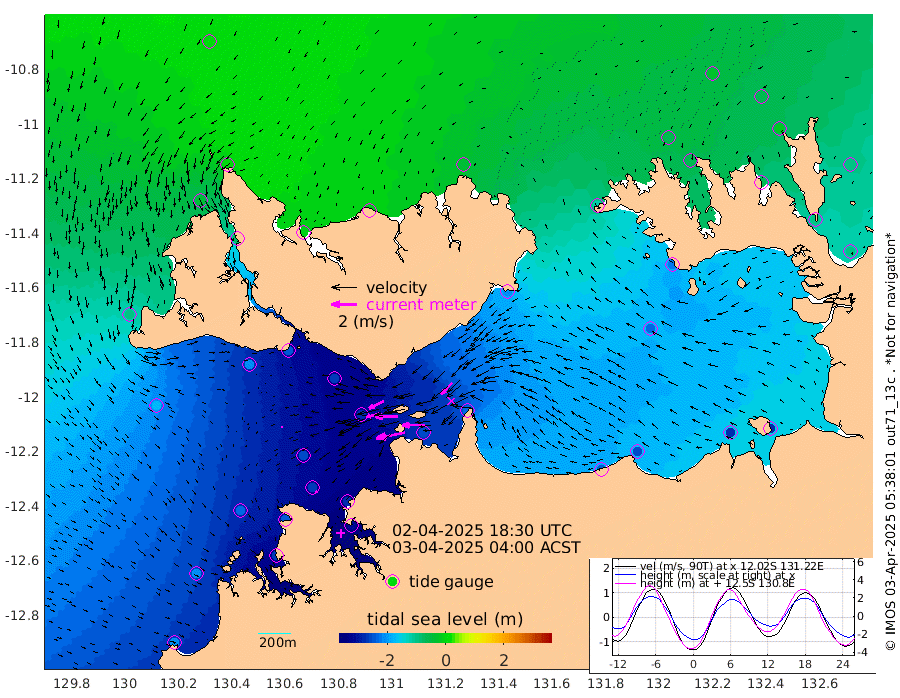 232cm/s -101T +4cm/s rms + 6cm/s 51T. Darwin_C1 52m 178cm/s -91T +4cm/s rms + 7cm/s -161T. Darwin_CW1 22m 101cm/s -105T +4cm/s rms + 8cm/s 61T. Darwin_CW2 34m 123cm/s -136T +3cm/s rms + 9cm/s 98T. Darwin_CW3 22m 178cm/s -90T +5cm/s rms + 7cm/s 88T. Darwin_C3 56m 131cm/s -115T +2cm/s rms + 9cm/s -126T. Darwin_CTbW 22m 10cm/s -180T +1cm/s rms + 1cm/s -47T. DARBGF 30m 19cm/s 161T +4cm/s rms + 3cm/s 80T. NRSDAR 19m 4cm Goodrich Bank -207cm Point Jenny -204cm Native Point -226cm Fish Reef -240cm Tapa Bay -93cm Point Fawcett (Offshore) -267cm Burge Point -210cm Munkunuwa -172cm Beagle A -269cm Parsons Bank -252cm Fenton Patches -273cm Hancox Shoal Area -272cm Nightcliff -304cm Darwin -268cm Charles Point Patches -255cm Glyde Point -242cm Chambers Bay -252cm Point Stuart -236cm Cape Hotham -229cm Christine Reef -272cm West Alligator Head -271cm East Field Island -217cm Two Hills Bay -206cm Camp Point -236cm Medina Inlet South -73cm South Barlow Point -36cm St. Asaph Bay 2cm Cape Van Dieman -10cm Snake Bay -12cm Cache Point -41cm Point Jahleel (Off) -118cm Cape Don -58cm Port Essington -57cm Smith Point - West -58cm NW Peacock Island -30cm North Of Jones Shoal -14cm Peacock Island -95cm Point David -65cm D'urville Point -99cm Copeland Island -92cm One Tree Point