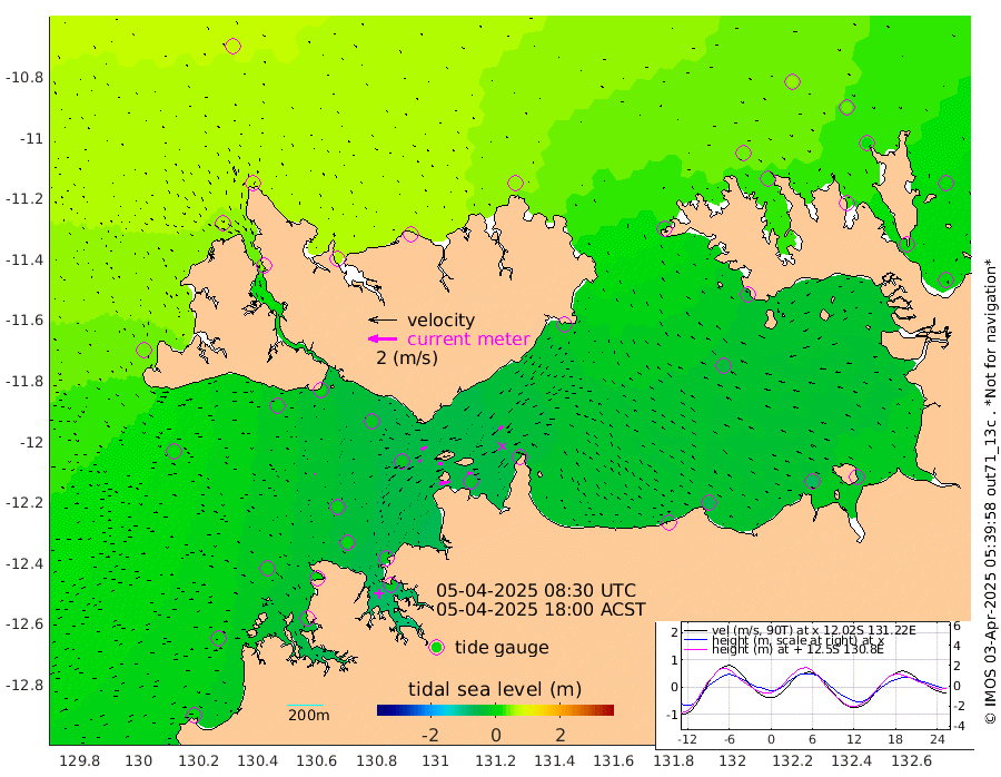 78cm/s -101T +4cm/s rms + 6cm/s 51T. Darwin_C1 52m 31cm/s -90T +4cm/s rms + 7cm/s -161T. Darwin_CW1 22m 19cm/s -108T +4cm/s rms + 8cm/s 61T. Darwin_CW2 34m 36cm/s -132T +3cm/s rms + 9cm/s 98T. Darwin_CW3 22m 26cm/s -90T +5cm/s rms + 7cm/s 88T. Darwin_C3 56m 47cm/s -116T +2cm/s rms + 9cm/s -126T. Darwin_CTbW 22m 6cm/s 103T +1cm/s rms + 1cm/s -47T. DARBGF 30m 8cm/s 156T +4cm/s rms + 3cm/s 80T. NRSDAR 19m 68cm Goodrich Bank 7cm Point Jenny 10cm Native Point -2cm Fish Reef 0cm Tapa Bay 44cm Point Fawcett (Offshore) -2cm Burge Point -6cm Munkunuwa 22cm Beagle A -20cm Parsons Bank -3cm Fenton Patches -19cm Hancox Shoal Area -13cm Nightcliff -14cm Darwin 8cm Charles Point Patches -24cm Glyde Point -43cm Chambers Bay -58cm Point Stuart -32cm Cape Hotham -36cm Christine Reef -69cm West Alligator Head -69cm East Field Island -37cm Two Hills Bay -14cm Camp Point 2cm Medina Inlet South 49cm South Barlow Point 60cm St. Asaph Bay 66cm Cape Van Dieman 66cm Snake Bay 61cm Cache Point 45cm Point Jahleel (Off) 16cm Cape Don 39cm Port Essington 34cm Smith Point - West 35cm NW Peacock Island 50cm North Of Jones Shoal 16cm Peacock Island 16cm Point David 30cm D'urville Point 11cm Copeland Island 21cm One Tree Point