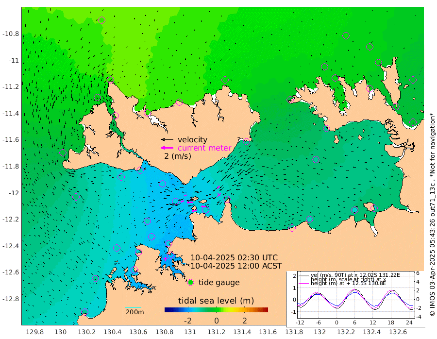 80cm/s -101T +4cm/s rms + 6cm/s 51T. Darwin_C1 52m 78cm/s -92T +4cm/s rms + 7cm/s -161T. Darwin_CW1 22m 55cm/s -106T +4cm/s rms + 8cm/s 61T. Darwin_CW2 34m 55cm/s -137T +3cm/s rms + 9cm/s 98T. Darwin_CW3 22m 99cm/s -91T +5cm/s rms + 7cm/s 88T. Darwin_C3 56m 34cm/s -116T +2cm/s rms + 9cm/s -126T. Darwin_CTbW 22m 6cm/s -176T +1cm/s rms + 1cm/s -47T. DARBGF 30m 8cm/s 168T +4cm/s rms + 3cm/s 80T. NRSDAR 19m 33cm Goodrich Bank -110cm Point Jenny -108cm Native Point -126cm Fish Reef -135cm Tapa Bay -37cm Point Fawcett (Offshore) -151cm Burge Point -126cm Munkunuwa -81cm Beagle A -148cm Parsons Bank -135cm Fenton Patches -149cm Hancox Shoal Area -147cm Nightcliff -172cm Darwin -149cm Charles Point Patches -135cm Glyde Point -127cm Chambers Bay -130cm Point Stuart -123cm Cape Hotham -103cm Christine Reef -140cm West Alligator Head -137cm East Field Island -103cm Two Hills Bay -105cm Camp Point -132cm Medina Inlet South -18cm South Barlow Point 3cm St. Asaph Bay 30cm Cape Van Dieman 26cm Snake Bay 26cm Cache Point 8cm Point Jahleel (Off) -40cm Cape Don -4cm Port Essington 4cm Smith Point - West 4cm NW Peacock Island 17cm North Of Jones Shoal 4cm Peacock Island -28cm Point David 0cm D'urville Point -31cm Copeland Island -24cm One Tree Point