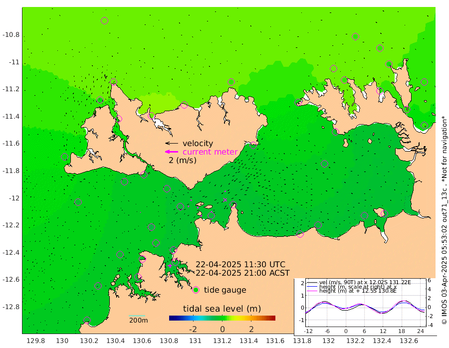 23cm/s -103T +4cm/s rms + 6cm/s 51T. Darwin_C1 52m 9cm/s -79T +4cm/s rms + 7cm/s -161T. Darwin_CW1 22m 18cm/s -112T +4cm/s rms + 8cm/s 61T. Darwin_CW2 34m 19cm/s -139T +3cm/s rms + 9cm/s 98T. Darwin_CW3 22m 17cm/s -90T +5cm/s rms + 7cm/s 88T. Darwin_C3 56m 15cm/s -113T +2cm/s rms + 9cm/s -126T. Darwin_CTbW 22m 5cm/s -104T +1cm/s rms + 1cm/s -47T. DARBGF 30m 4cm/s -78T +4cm/s rms + 3cm/s 80T. NRSDAR 19m 39cm Goodrich Bank -29cm Point Jenny -27cm Native Point -31cm Fish Reef -32cm Tapa Bay 7cm Point Fawcett (Offshore) -39cm Burge Point -27cm Munkunuwa -28cm Beagle A -29cm Parsons Bank -46cm Fenton Patches -36cm Hancox Shoal Area -55cm Nightcliff -33cm Darwin -19cm Charles Point Patches -34cm Glyde Point -50cm Chambers Bay -44cm Point Stuart -35cm Cape Hotham -44cm Christine Reef -53cm West Alligator Head -58cm East Field Island -29cm Two Hills Bay -28cm Camp Point -26cm Medina Inlet South 17cm South Barlow Point 21cm St. Asaph Bay 38cm Cape Van Dieman 39cm Snake Bay 35cm Cache Point 25cm Point Jahleel (Off) 10cm Cape Don 35cm Port Essington 29cm Smith Point - West 33cm NW Peacock Island 34cm North Of Jones Shoal 12cm Peacock Island 31cm Point David 32cm D'urville Point 28cm Copeland Island 31cm One Tree Point