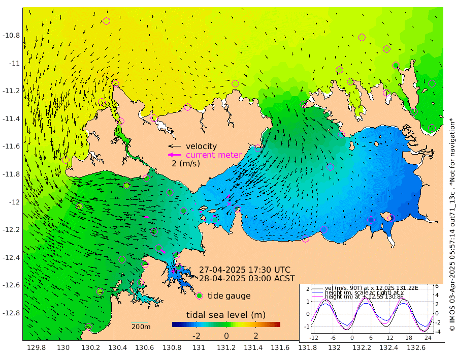23cm/s -101T +4cm/s rms + 6cm/s 51T. Darwin_C1 52m 42cm/s -92T +4cm/s rms + 7cm/s -161T. Darwin_CW1 22m 8cm/s 71T +4cm/s rms + 8cm/s 61T. Darwin_CW2 34m 65cm/s -144T +3cm/s rms + 9cm/s 98T. Darwin_CW3 22m 35cm/s -86T +5cm/s rms + 7cm/s 88T. Darwin_C3 56m 10cm/s 59T +2cm/s rms + 9cm/s -126T. Darwin_CTbW 22m 84cm/s 96T +1cm/s rms + 1cm/s -47T. DARBGF 30m 92cm/s 127T +4cm/s rms + 3cm/s 80T. NRSDAR 19m 89cm Goodrich Bank 33cm Point Jenny 34cm Native Point 22cm Fish Reef 11cm Tapa Bay 96cm Point Fawcett (Offshore) -14cm Burge Point 37cm Munkunuwa 46cm Beagle A -18cm Parsons Bank -13cm Fenton Patches -42cm Hancox Shoal Area -30cm Nightcliff -50cm Darwin -13cm Charles Point Patches -103cm Glyde Point -179cm Chambers Bay -209cm Point Stuart -122cm Cape Hotham -166cm Christine Reef -238cm West Alligator Head -284cm East Field Island -136cm Two Hills Bay -138cm Camp Point 12cm Medina Inlet South 94cm South Barlow Point 104cm St. Asaph Bay 97cm Cape Van Dieman 89cm Snake Bay 86cm Cache Point 56cm Point Jahleel (Off) 0cm Cape Don 51cm Port Essington 56cm Smith Point - West 46cm NW Peacock Island 65cm North Of Jones Shoal 21cm Peacock Island 7cm Point David 48cm D'urville Point 1cm Copeland Island 13cm One Tree Point