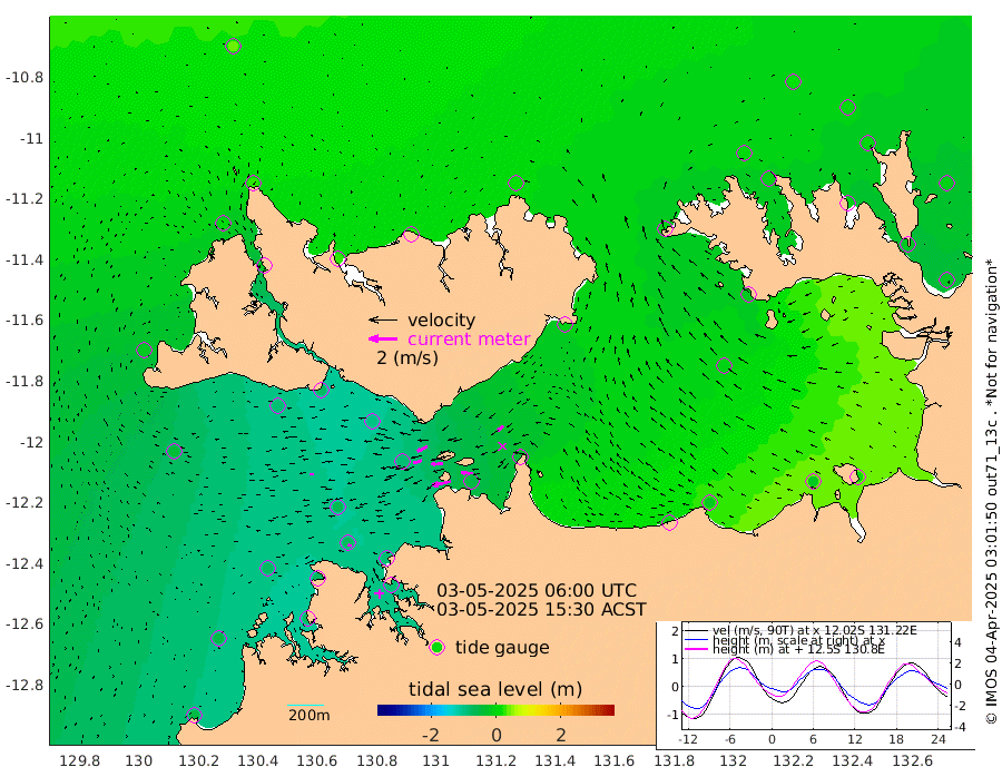 135cm/s -102T +4cm/s rms + 6cm/s 51T. Darwin_C1 52m 77cm/s -89T +4cm/s rms + 7cm/s -161T. Darwin_CW1 22m 62cm/s -107T +4cm/s rms + 8cm/s 61T. Darwin_CW2 34m 51cm/s -129T +3cm/s rms + 9cm/s 98T. Darwin_CW3 22m 78cm/s -91T +5cm/s rms + 7cm/s 88T. Darwin_C3 56m 75cm/s -115T +2cm/s rms + 9cm/s -126T. Darwin_CTbW 22m 30cm/s -91T +1cm/s rms + 1cm/s -47T. DARBGF 30m 26cm/s -73T +4cm/s rms + 3cm/s 80T. NRSDAR 19m 34cm Goodrich Bank -54cm Point Jenny -53cm Native Point -70cm Fish Reef -69cm Tapa Bay -13cm Point Fawcett (Offshore) -70cm Burge Point -84cm Munkunuwa -37cm Beagle A -93cm Parsons Bank -67cm Fenton Patches -81cm Hancox Shoal Area -79cm Nightcliff -89cm Darwin -71cm Charles Point Patches -45cm Glyde Point -10cm Chambers Bay -12cm Point Stuart -34cm Cape Hotham -4cm Christine Reef -12cm West Alligator Head 11cm East Field Island -20cm Two Hills Bay 0cm Camp Point -74cm Medina Inlet South -14cm South Barlow Point 9cm St. Asaph Bay 29cm Cape Van Dieman 23cm Snake Bay 30cm Cache Point 16cm Point Jahleel (Off) -7cm Cape Don 3cm Port Essington -2cm Smith Point - West 1cm NW Peacock Island 17cm North Of Jones Shoal 3cm Peacock Island -15cm Point David -7cm D'urville Point -19cm Copeland Island -10cm One Tree Point