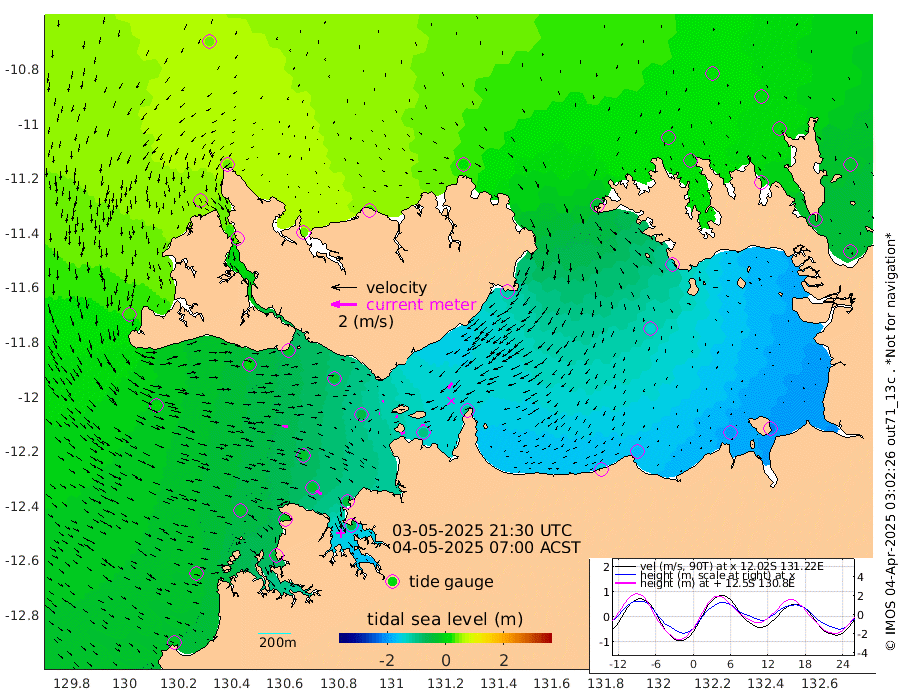 33cm/s -103T +4cm/s rms + 6cm/s 51T. Darwin_C1 52m 22cm/s -91T +4cm/s rms + 7cm/s -161T. Darwin_CW1 22m 6cm/s 66T +4cm/s rms + 8cm/s 61T. Darwin_CW2 34m 55cm/s -143T +3cm/s rms + 9cm/s 98T. Darwin_CW3 22m 15cm/s -82T +5cm/s rms + 7cm/s 88T. Darwin_C3 56m 11cm/s -112T +2cm/s rms + 9cm/s -126T. Darwin_CTbW 22m 46cm/s 95T +1cm/s rms + 1cm/s -47T. DARBGF 30m 52cm/s 125T +4cm/s rms + 3cm/s 80T. NRSDAR 19m 42cm Goodrich Bank -12cm Point Jenny -7cm Native Point -16cm Fish Reef -19cm Tapa Bay 28cm Point Fawcett (Offshore) -34cm Burge Point 9cm Munkunuwa 6cm Beagle A -33cm Parsons Bank -26cm Fenton Patches -48cm Hancox Shoal Area -36cm Nightcliff -51cm Darwin -32cm Charles Point Patches -93cm Glyde Point -156cm Chambers Bay -175cm Point Stuart -110cm Cape Hotham -139cm Christine Reef -194cm West Alligator Head -222cm East Field Island -125cm Two Hills Bay -118cm Camp Point -13cm Medina Inlet South 45cm South Barlow Point 49cm St. Asaph Bay 44cm Cape Van Dieman 43cm Snake Bay 30cm Cache Point 15cm Point Jahleel (Off) -35cm Cape Don 2cm Port Essington 8cm Smith Point - West 1cm NW Peacock Island 14cm North Of Jones Shoal 3cm Peacock Island -35cm Point David 1cm D'urville Point -39cm Copeland Island -32cm One Tree Point
