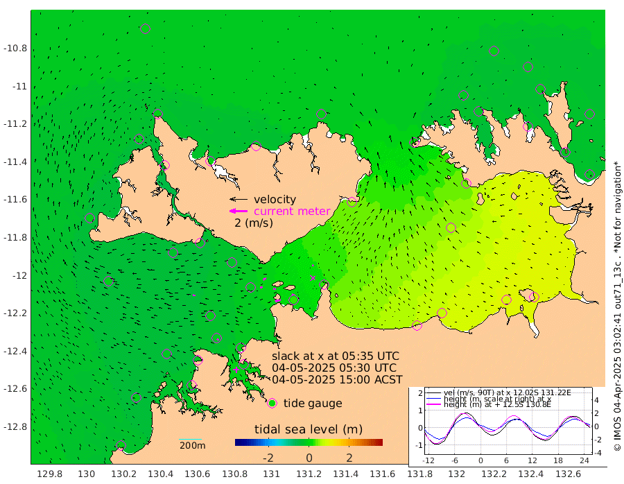 66cm/s -102T +4cm/s rms + 6cm/s 51T. Darwin_C1 52m 29cm/s -90T +4cm/s rms + 7cm/s -161T. Darwin_CW1 22m 32cm/s -111T +4cm/s rms + 8cm/s 61T. Darwin_CW2 34m 16cm/s -102T +3cm/s rms + 9cm/s 98T. Darwin_CW3 22m 28cm/s -94T +5cm/s rms + 7cm/s 88T. Darwin_C3 56m 35cm/s -117T +2cm/s rms + 9cm/s -126T. Darwin_CTbW 22m 30cm/s -87T +1cm/s rms + 1cm/s -47T. DARBGF 30m 26cm/s -63T +4cm/s rms + 3cm/s 80T. NRSDAR 19m 0cm Goodrich Bank -7cm Point Jenny -7cm Native Point -15cm Fish Reef -12cm Tapa Bay -11cm Point Fawcett (Offshore) -3cm Burge Point -30cm Munkunuwa -4cm Beagle A -26cm Parsons Bank -4cm Fenton Patches -14cm Hancox Shoal Area -11cm Nightcliff -14cm Darwin -14cm Charles Point Patches 23cm Glyde Point 67cm Chambers Bay 73cm Point Stuart 33cm Cape Hotham 65cm Christine Reef 84cm West Alligator Head 109cm East Field Island 44cm Two Hills Bay 55cm Camp Point -19cm Medina Inlet South -23cm South Barlow Point -11cm St. Asaph Bay -4cm Cape Van Dieman -10cm Snake Bay 1cm Cache Point 0cm Point Jahleel (Off) 5cm Cape Don -12cm Port Essington -17cm Smith Point - West -15cm NW Peacock Island -10cm North Of Jones Shoal -5cm Peacock Island -19cm Point David -21cm D'urville Point -20cm Copeland Island -17cm One Tree Point
