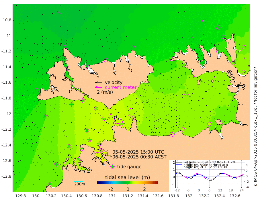 69cm/s 79T +4cm/s rms + 6cm/s 51T. Darwin_C1 52m 28cm/s 90T +4cm/s rms + 7cm/s -161T. Darwin_CW1 22m 18cm/s 71T +4cm/s rms + 8cm/s 61T. Darwin_CW2 34m 38cm/s 46T +3cm/s rms + 9cm/s 98T. Darwin_CW3 22m 25cm/s 90T +5cm/s rms + 7cm/s 88T. Darwin_C3 56m 36cm/s 64T +2cm/s rms + 9cm/s -126T. Darwin_CTbW 22m 1cm/s 74T +1cm/s rms + 1cm/s -47T. DARBGF 30m 5cm/s -36T +4cm/s rms + 3cm/s 80T. NRSDAR 19m -29cm Goodrich Bank 20cm Point Jenny 15cm Native Point 29cm Fish Reef 26cm Tapa Bay 0cm Point Fawcett (Offshore) 24cm Burge Point 19cm Munkunuwa 3cm Beagle A 41cm Parsons Bank 20cm Fenton Patches 42cm Hancox Shoal Area 35cm Nightcliff 40cm Darwin 30cm Charles Point Patches 43cm Glyde Point 59cm Chambers Bay 64cm Point Stuart 51cm Cape Hotham 42cm Christine Reef 69cm West Alligator Head 65cm East Field Island 54cm Two Hills Bay 35cm Camp Point 25cm Medina Inlet South -12cm South Barlow Point -21cm St. Asaph Bay -26cm Cape Van Dieman -22cm Snake Bay -18cm Cache Point -7cm Point Jahleel (Off) 24cm Cape Don 10cm Port Essington 11cm Smith Point - West 13cm NW Peacock Island 3cm North Of Jones Shoal 4cm Peacock Island 41cm Point David 19cm D'urville Point 46cm Copeland Island 38cm One Tree Point