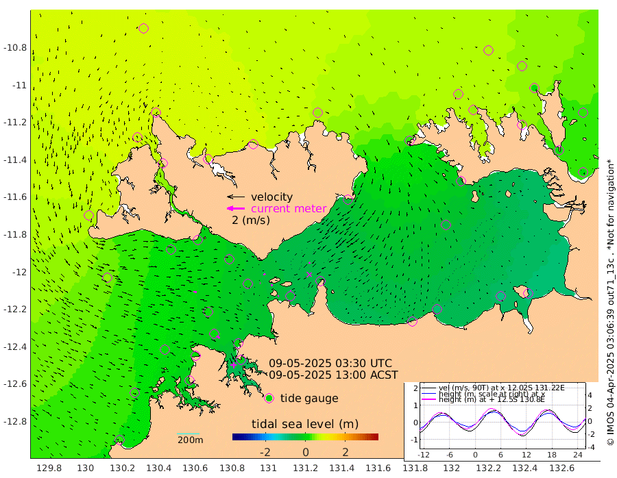 11cm/s 74T +4cm/s rms + 6cm/s 51T. Darwin_C1 52m 10cm/s -90T +4cm/s rms + 7cm/s -161T. Darwin_CW1 22m 4cm/s 72T +4cm/s rms + 8cm/s 61T. Darwin_CW2 34m 18cm/s -148T +3cm/s rms + 9cm/s 98T. Darwin_CW3 22m 16cm/s -88T +5cm/s rms + 7cm/s 88T. Darwin_C3 56m 24cm/s 63T +2cm/s rms + 9cm/s -126T. Darwin_CTbW 22m 38cm/s 96T +1cm/s rms + 1cm/s -47T. DARBGF 30m 40cm/s 127T +4cm/s rms + 3cm/s 80T. NRSDAR 19m 69cm Goodrich Bank 30cm Point Jenny 32cm Native Point 22cm Fish Reef 15cm Tapa Bay 61cm Point Fawcett (Offshore) 7cm Burge Point 16cm Munkunuwa 49cm Beagle A 0cm Parsons Bank 18cm Fenton Patches -8cm Hancox Shoal Area 8cm Nightcliff -10cm Darwin 7cm Charles Point Patches -30cm Glyde Point -65cm Chambers Bay -81cm Point Stuart -41cm Cape Hotham -51cm Christine Reef -94cm West Alligator Head -110cm East Field Island -43cm Two Hills Bay -42cm Camp Point 18cm Medina Inlet South 69cm South Barlow Point 71cm St. Asaph Bay 71cm Cape Van Dieman 72cm Snake Bay 67cm Cache Point 52cm Point Jahleel (Off) 24cm Cape Don 46cm Port Essington 53cm Smith Point - West 49cm NW Peacock Island 57cm North Of Jones Shoal 19cm Peacock Island 22cm Point David 49cm D'urville Point 18cm Copeland Island 28cm One Tree Point