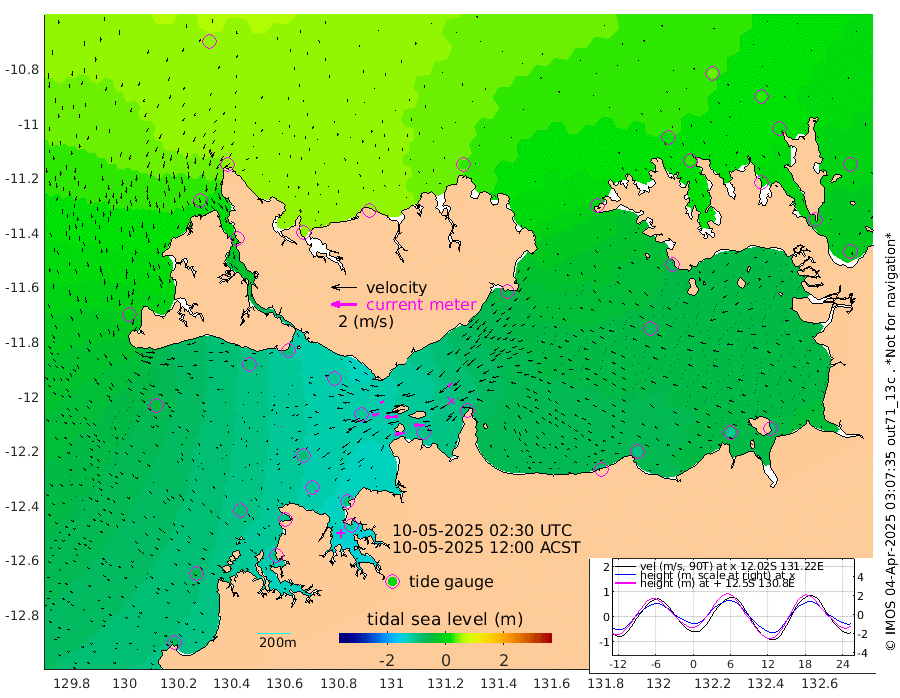 77cm/s -101T +4cm/s rms + 6cm/s 51T. Darwin_C1 52m 82cm/s -91T +4cm/s rms + 7cm/s -161T. Darwin_CW1 22m 51cm/s -106T +4cm/s rms + 8cm/s 61T. Darwin_CW2 34m 45cm/s -135T +3cm/s rms + 9cm/s 98T. Darwin_CW3 22m 95cm/s -91T +5cm/s rms + 7cm/s 88T. Darwin_C3 56m 33cm/s -116T +2cm/s rms + 9cm/s -126T. Darwin_CTbW 22m 5cm/s -179T +1cm/s rms + 1cm/s -47T. DARBGF 30m 7cm/s 175T +4cm/s rms + 3cm/s 80T. NRSDAR 19m 54cm Goodrich Bank -68cm Point Jenny -66cm Native Point -83cm Fish Reef -92cm Tapa Bay -5cm Point Fawcett (Offshore) -97cm Burge Point -89cm Munkunuwa -40cm Beagle A -105cm Parsons Bank -87cm Fenton Patches -106cm Hancox Shoal Area -101cm Nightcliff -122cm Darwin -101cm Charles Point Patches -94cm Glyde Point -89cm Chambers Bay -93cm Point Stuart -84cm Cape Hotham -68cm Christine Reef -103cm West Alligator Head -99cm East Field Island -69cm Two Hills Bay -66cm Camp Point -89cm Medina Inlet South 10cm South Barlow Point 28cm St. Asaph Bay 51cm Cape Van Dieman 49cm Snake Bay 49cm Cache Point 31cm Point Jahleel (Off) -11cm Cape Don 20cm Port Essington 24cm Smith Point - West 26cm NW Peacock Island 39cm North Of Jones Shoal 11cm Peacock Island -2cm Point David 21cm D'urville Point -6cm Copeland Island 3cm One Tree Point