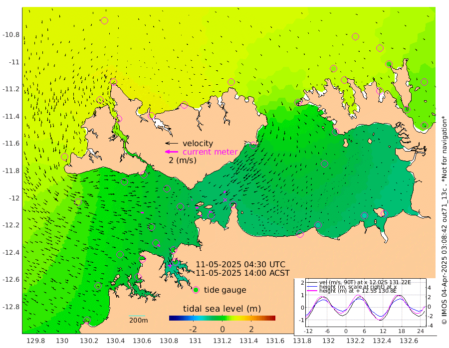 25cm/s -100T +4cm/s rms + 6cm/s 51T. Darwin_C1 52m 45cm/s -90T +4cm/s rms + 7cm/s -161T. Darwin_CW1 22m 9cm/s -104T +4cm/s rms + 8cm/s 61T. Darwin_CW2 34m 41cm/s -139T +3cm/s rms + 9cm/s 98T. Darwin_CW3 22m 46cm/s -90T +5cm/s rms + 7cm/s 88T. Darwin_C3 56m 9cm/s 60T +2cm/s rms + 9cm/s -126T. Darwin_CTbW 22m 41cm/s 98T +1cm/s rms + 1cm/s -47T. DARBGF 30m 45cm/s 130T +4cm/s rms + 3cm/s 80T. NRSDAR 19m 83cm Goodrich Bank 27cm Point Jenny 30cm Native Point 15cm Fish Reef 10cm Tapa Bay 67cm Point Fawcett (Offshore) 4cm Burge Point 11cm Munkunuwa 50cm Beagle A -8cm Parsons Bank 11cm Fenton Patches -19cm Hancox Shoal Area -2cm Nightcliff -22cm Darwin 0cm Charles Point Patches -42cm Glyde Point -84cm Chambers Bay -102cm Point Stuart -53cm Cape Hotham -67cm Christine Reef -119cm West Alligator Head -137cm East Field Island -58cm Two Hills Bay -50cm Camp Point 11cm Medina Inlet South 77cm South Barlow Point 82cm St. Asaph Bay 86cm Cape Van Dieman 87cm Snake Bay 80cm Cache Point 62cm Point Jahleel (Off) 25cm Cape Don 54cm Port Essington 59cm Smith Point - West 57cm NW Peacock Island 67cm North Of Jones Shoal 23cm Peacock Island 33cm Point David 57cm D'urville Point 27cm Copeland Island 37cm One Tree Point