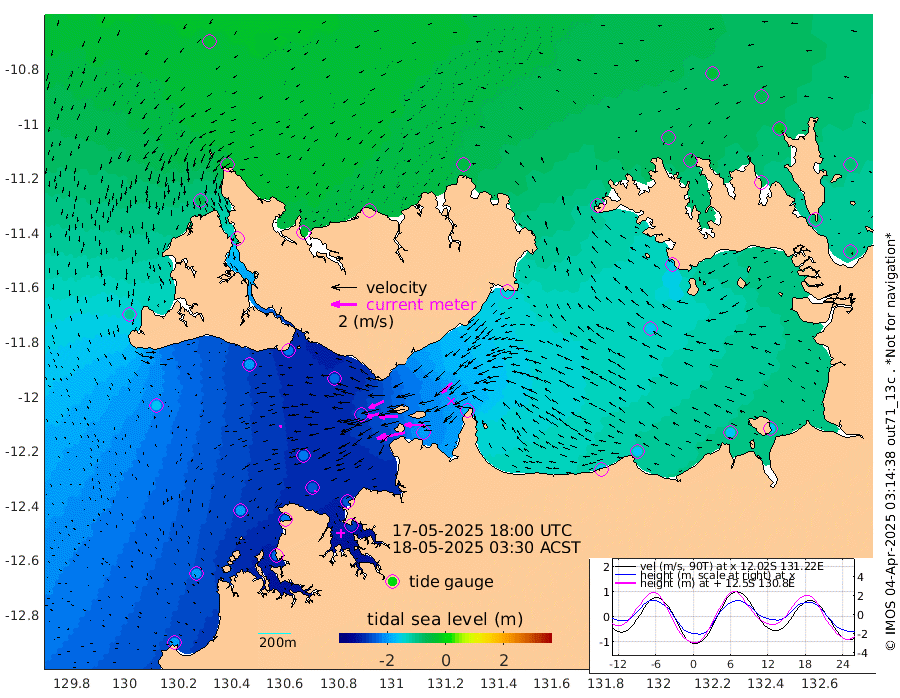 225cm/s -102T +4cm/s rms + 6cm/s 51T. Darwin_C1 52m 156cm/s -90T +4cm/s rms + 7cm/s -161T. Darwin_CW1 22m 96cm/s -106T +4cm/s rms + 8cm/s 61T. Darwin_CW2 34m 112cm/s -134T +3cm/s rms + 9cm/s 98T. Darwin_CW3 22m 147cm/s -90T +5cm/s rms + 7cm/s 88T. Darwin_C3 56m 128cm/s -115T +2cm/s rms + 9cm/s -126T. Darwin_CTbW 22m 20cm/s -109T +1cm/s rms + 1cm/s -47T. DARBGF 30m 11cm/s -124T +4cm/s rms + 3cm/s 80T. NRSDAR 19m -31cm Goodrich Bank -196cm Point Jenny -197cm Native Point -198cm Fish Reef -225cm Tapa Bay -107cm Point Fawcett (Offshore) -234cm Burge Point -195cm Munkunuwa -166cm Beagle A -234cm Parsons Bank -223cm Fenton Patches -238cm Hancox Shoal Area -243cm Nightcliff -262cm Darwin -242cm Charles Point Patches -201cm Glyde Point -166cm Chambers Bay -160cm Point Stuart -172cm Cape Hotham -163cm Christine Reef -169cm West Alligator Head -158cm East Field Island -149cm Two Hills Bay -155cm Camp Point -215cm Medina Inlet South -95cm South Barlow Point -65cm St. Asaph Bay -33cm Cape Van Dieman -44cm Snake Bay -38cm Cache Point -55cm Point Jahleel (Off) -105cm Cape Don -66cm Port Essington -66cm Smith Point - West -65cm NW Peacock Island -45cm North Of Jones Shoal -17cm Peacock Island -89cm Point David -71cm D'urville Point -89cm Copeland Island -84cm One Tree Point