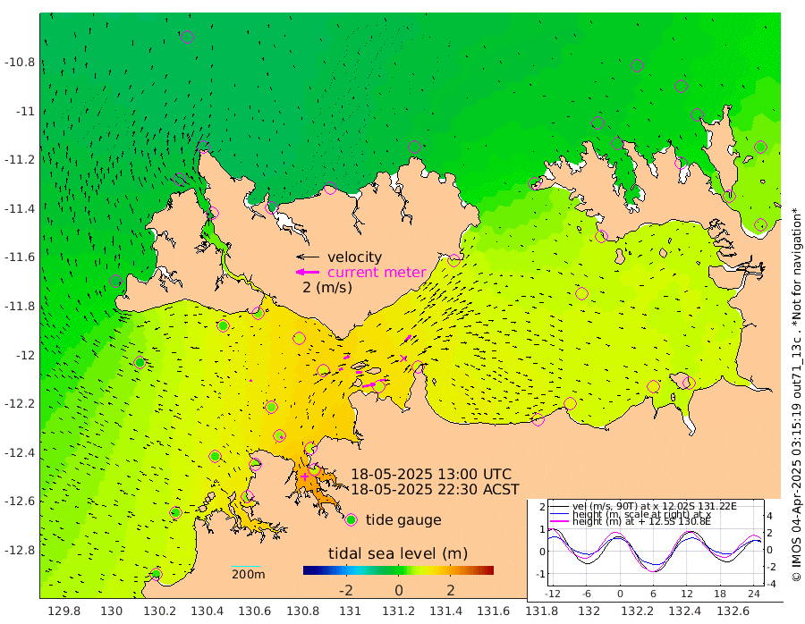 112cm/s 78T +4cm/s rms + 6cm/s 51T. Darwin_C1 52m 56cm/s 93T +4cm/s rms + 7cm/s -161T. Darwin_CW1 22m 31cm/s 71T +4cm/s rms + 8cm/s 61T. Darwin_CW2 34m 76cm/s 42T +3cm/s rms + 9cm/s 98T. Darwin_CW3 22m 52cm/s 90T +5cm/s rms + 7cm/s 88T. Darwin_C3 56m 53cm/s 65T +2cm/s rms + 9cm/s -126T. Darwin_CTbW 22m 18cm/s -81T +1cm/s rms + 1cm/s -47T. DARBGF 30m 23cm/s -44T +4cm/s rms + 3cm/s 80T. NRSDAR 19m -60cm Goodrich Bank 24cm Point Jenny 23cm Native Point 26cm Fish Reef 47cm Tapa Bay -35cm Point Fawcett (Offshore) 46cm Burge Point 32cm Munkunuwa -3cm Beagle A 71cm Parsons Bank 42cm Fenton Patches 81cm Hancox Shoal Area 71cm Nightcliff 78cm Darwin 52cm Charles Point Patches 77cm Glyde Point 95cm Chambers Bay 102cm Point Stuart 80cm Cape Hotham 82cm Christine Reef 112cm West Alligator Head 115cm East Field Island 77cm Two Hills Bay 70cm Camp Point 37cm Medina Inlet South -35cm South Barlow Point -54cm St. Asaph Bay -58cm Cape Van Dieman -49cm Snake Bay -54cm Cache Point -30cm Point Jahleel (Off) 15cm Cape Don -13cm Port Essington -12cm Smith Point - West -5cm NW Peacock Island -29cm North Of Jones Shoal -6cm Peacock Island 43cm Point David 1cm D'urville Point 49cm Copeland Island 30cm One Tree Point
